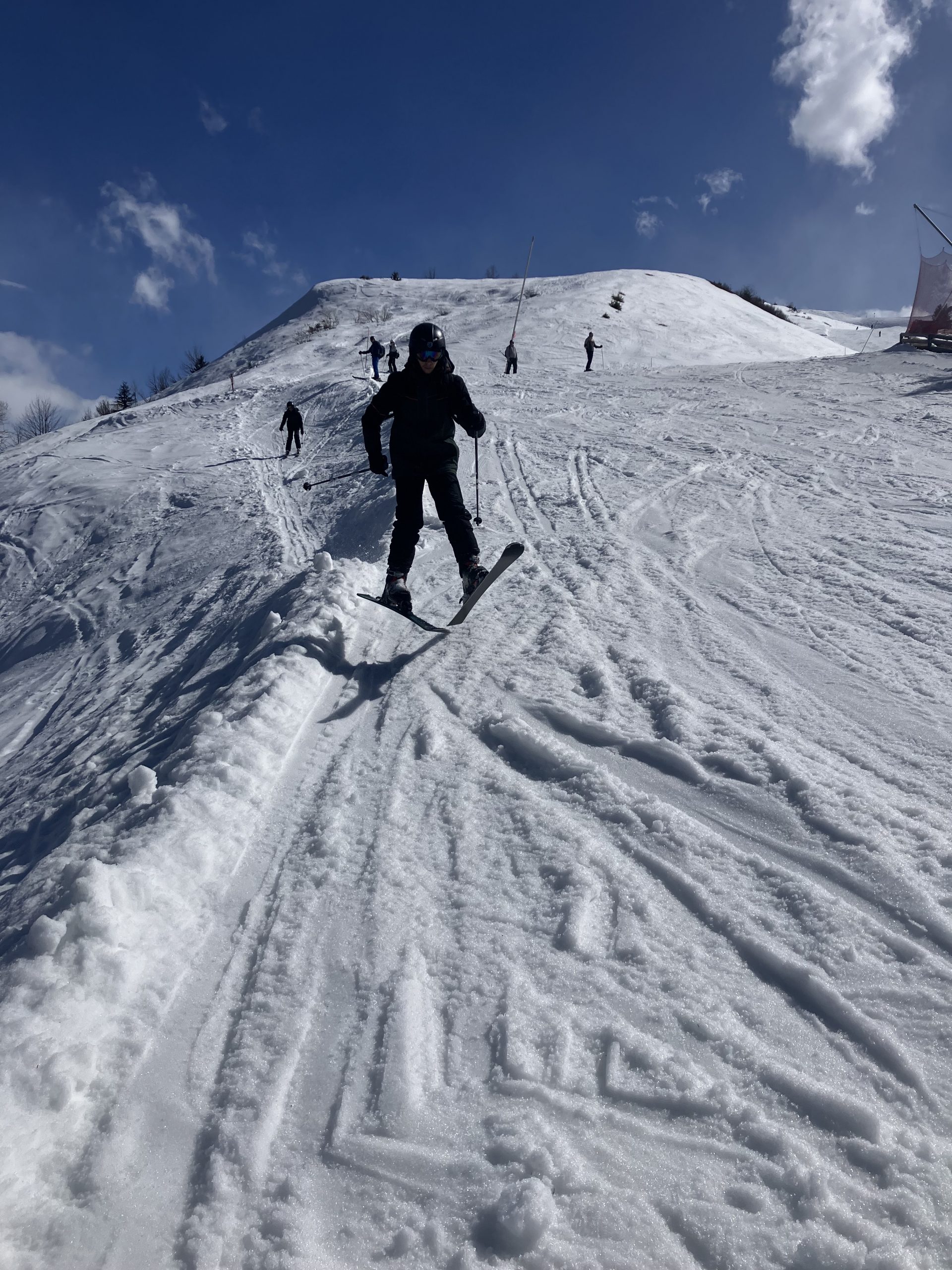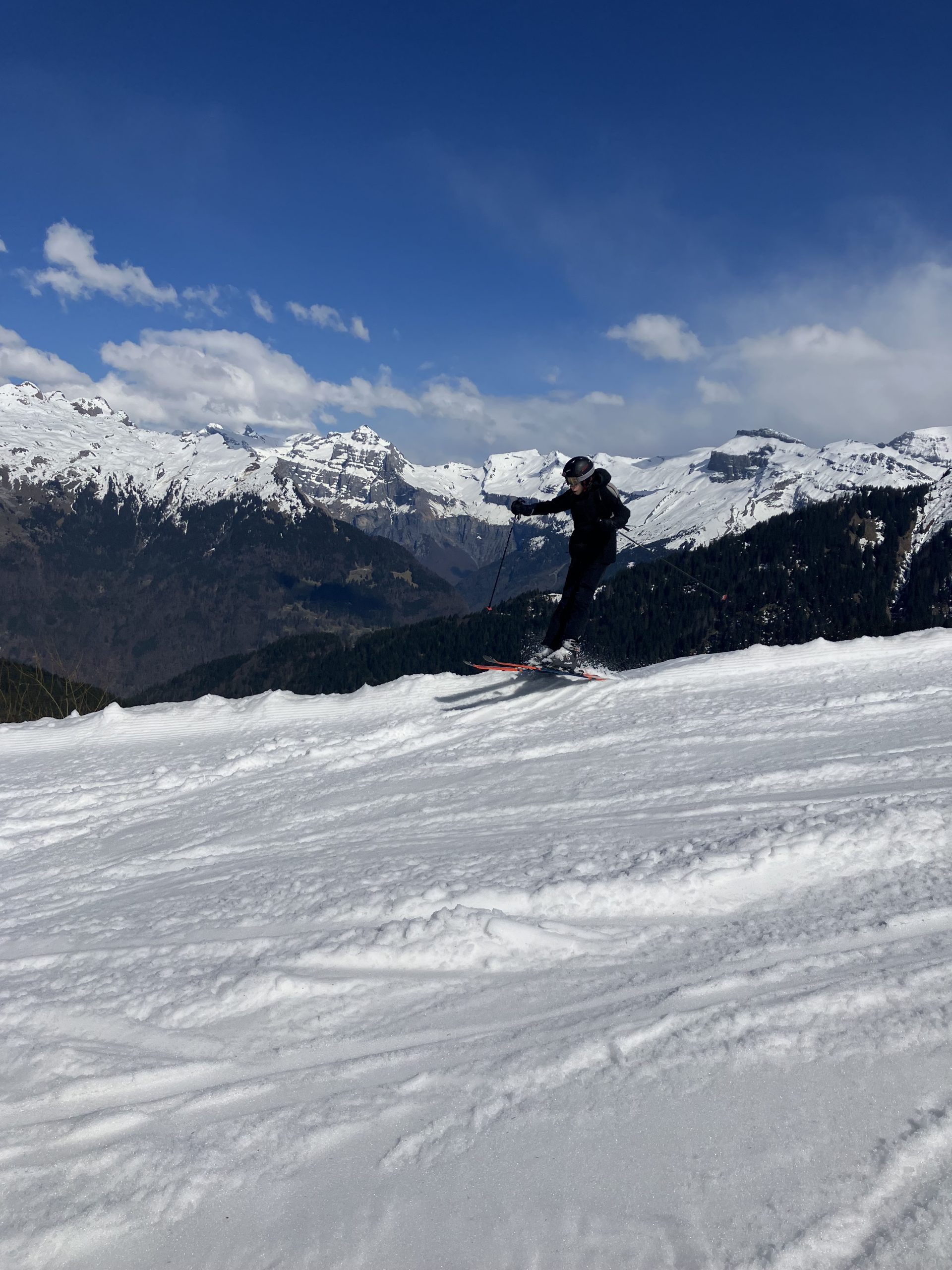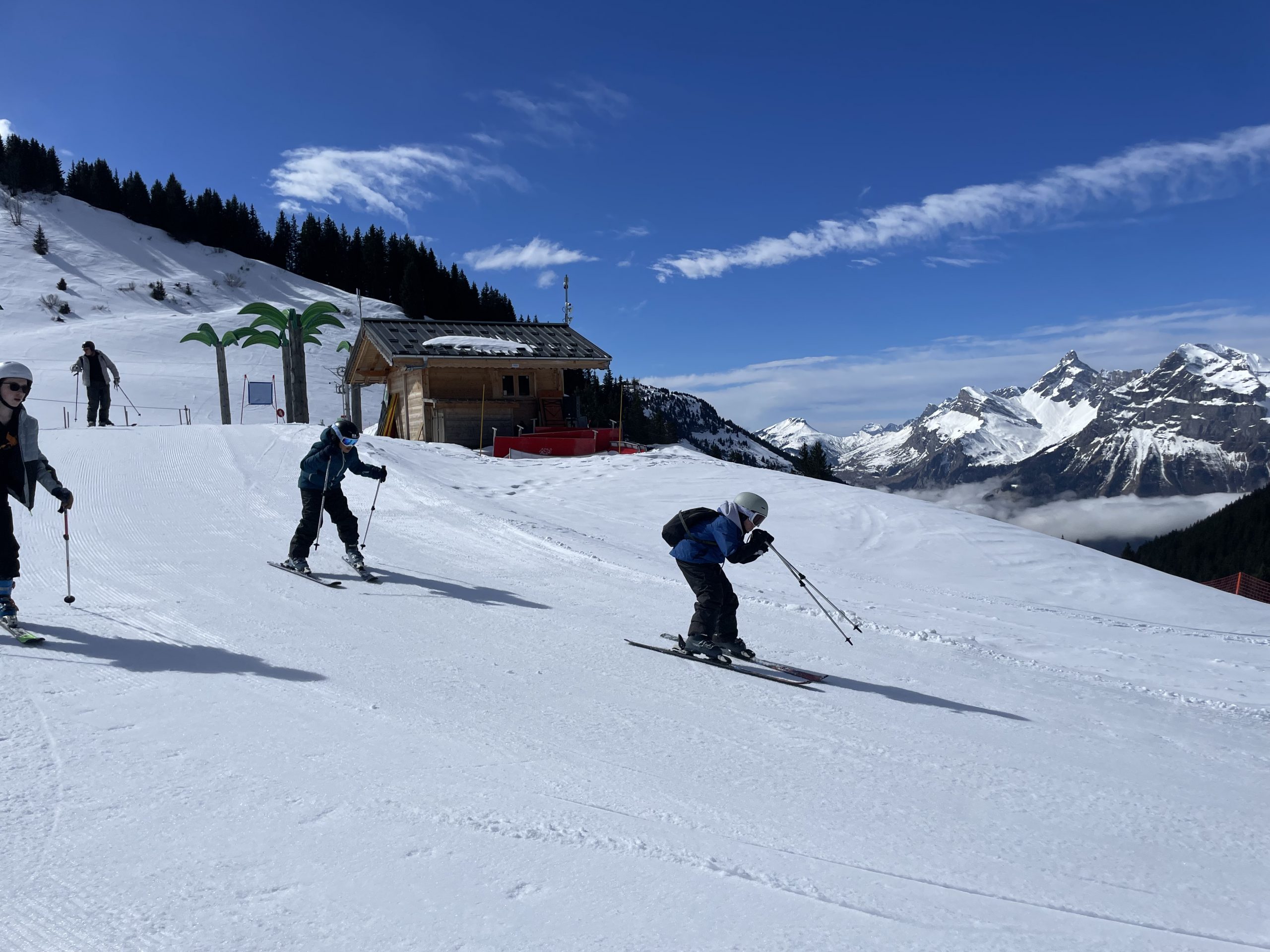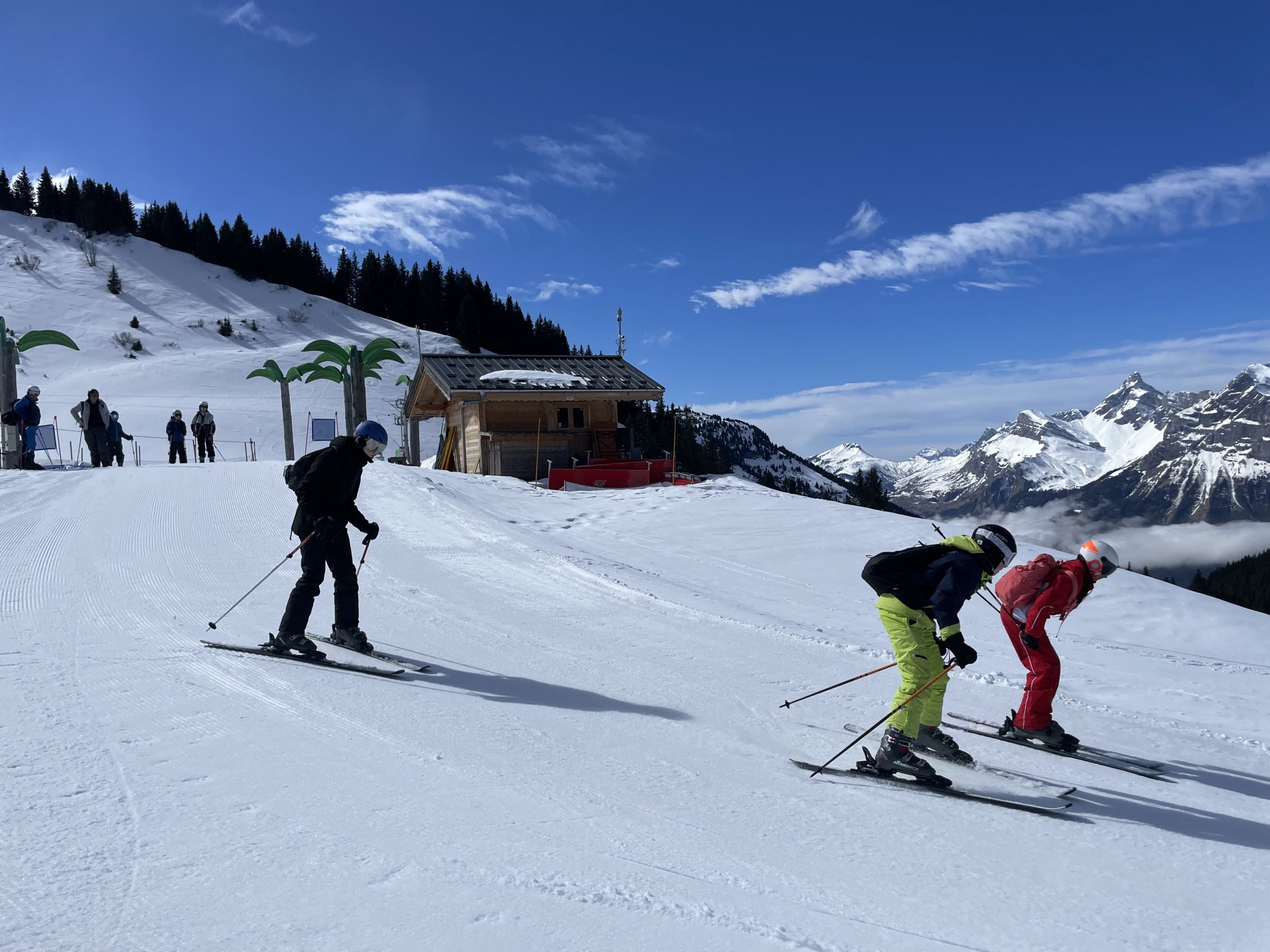 Comme chaque matin, nous nous dirigeons avec entrain vers la remontée Chariande Express, telle une flotte de skieurs déterminés vers les sommets de la montagne des Carroz. Nous entamons notre journée par une série de virages subtils avant de nous lancer dans un grand schuss sur la « Perce-Neige » (bleue), suivi de la verte « Molliachets ». Voilà un échauffement exquis qui nous prépare à affronter la « Rhodos » (rouge), un petit aperçu de la « Combe haut » (bleue), et le boulevard « Zorta » (rouge). Cette matinée témoigne des progrès époustouflants de chaque élève, qui, à chaque descente, semble défier les lois de la gravité avec une aisance inégalée !