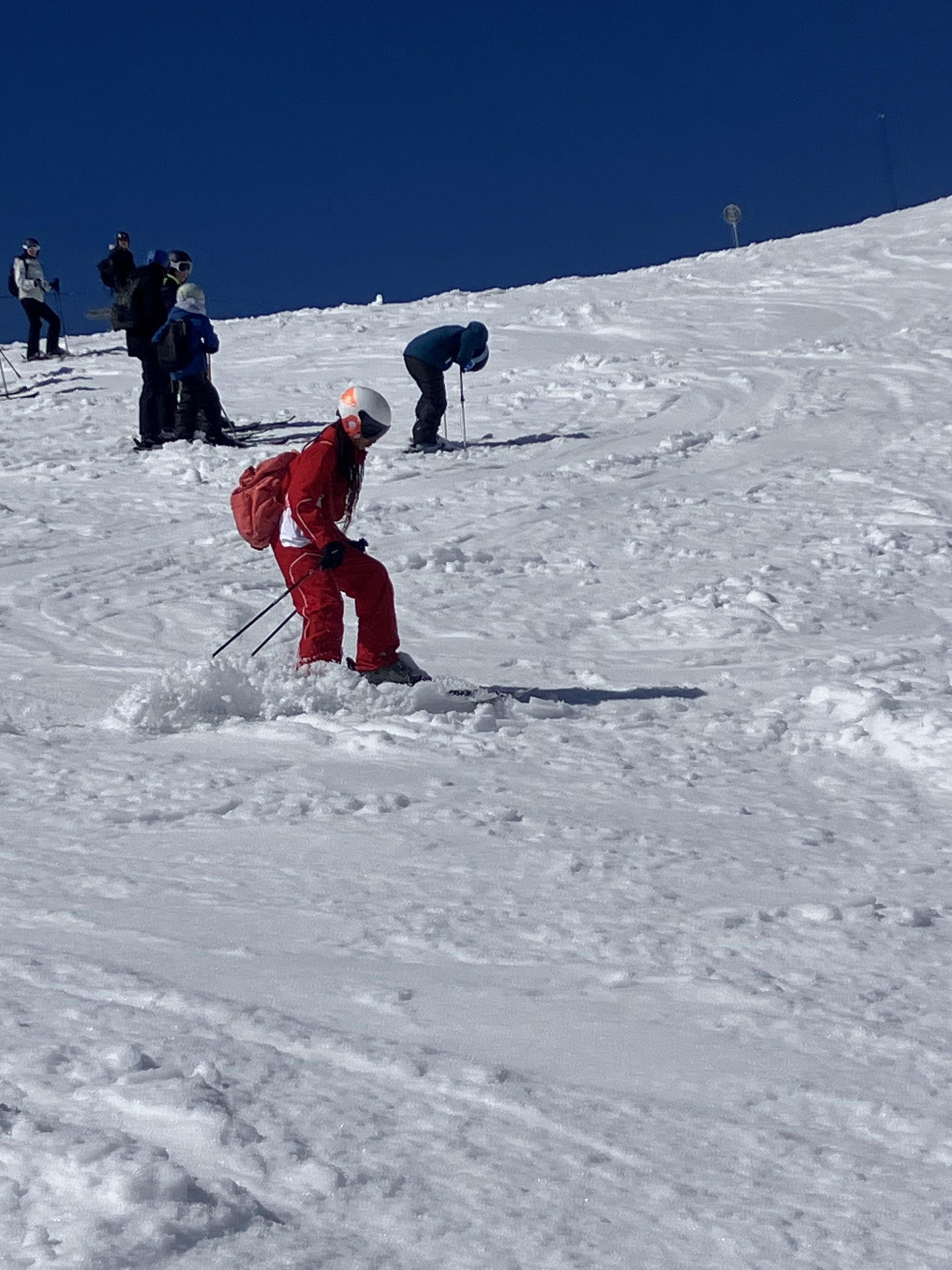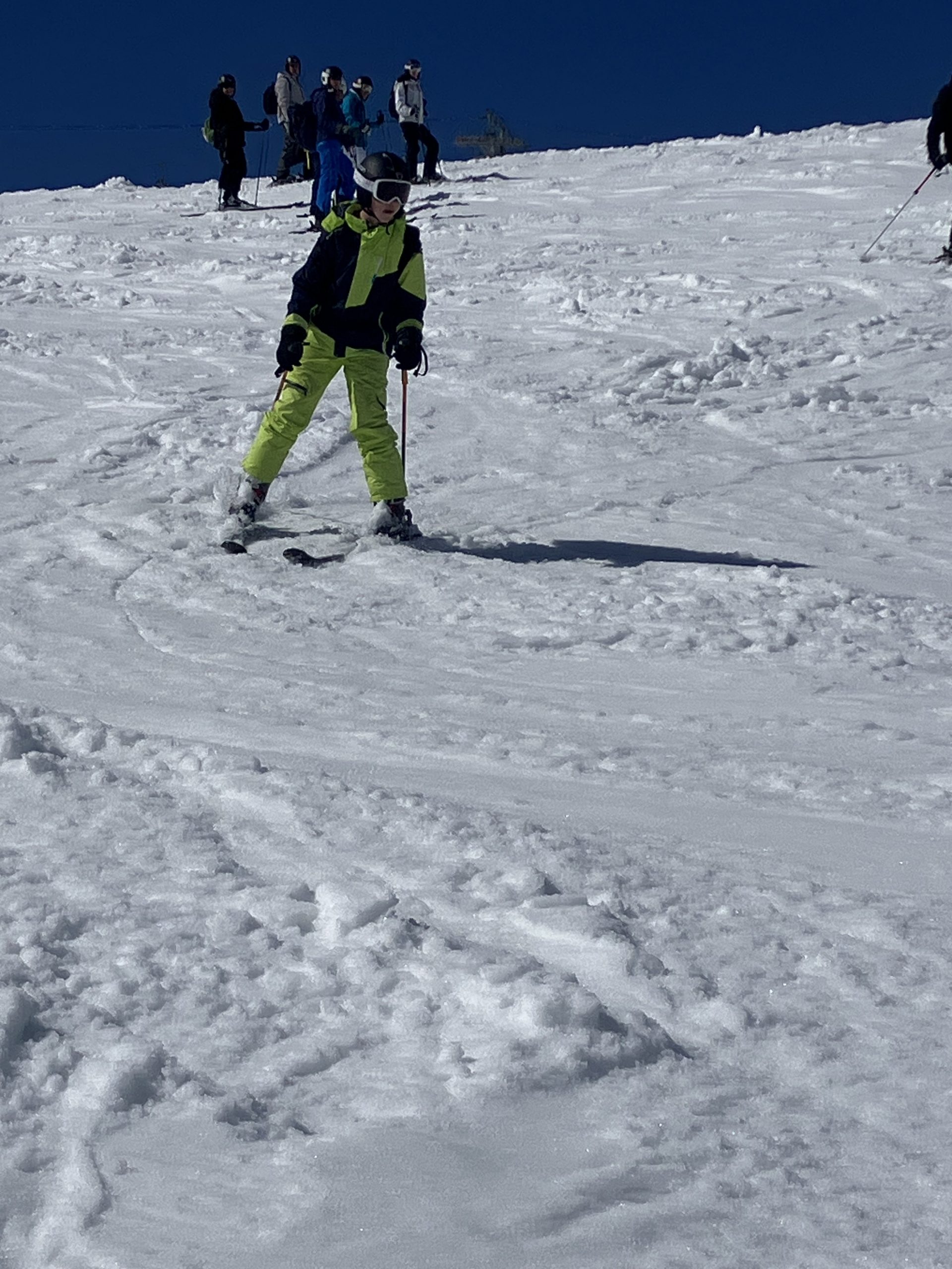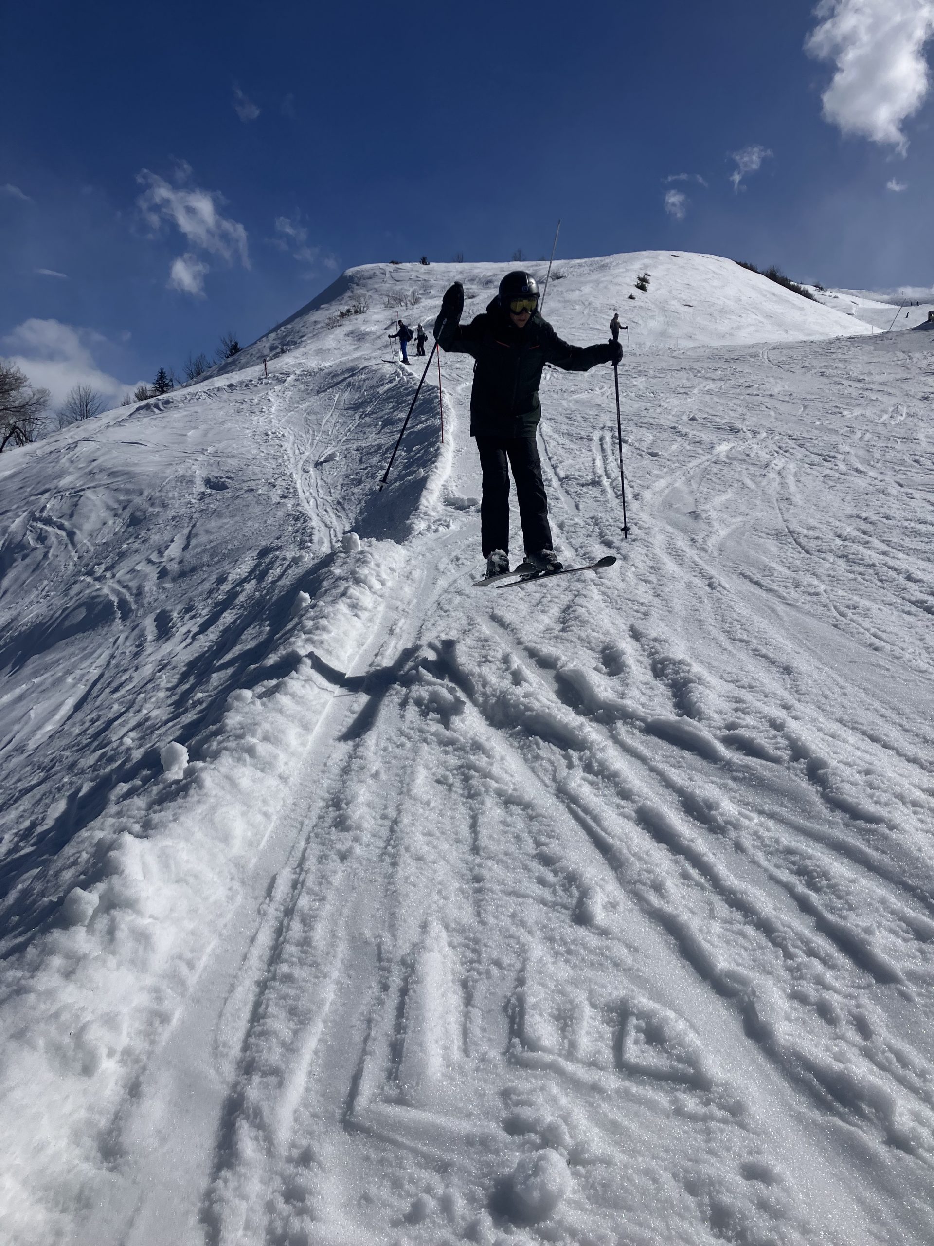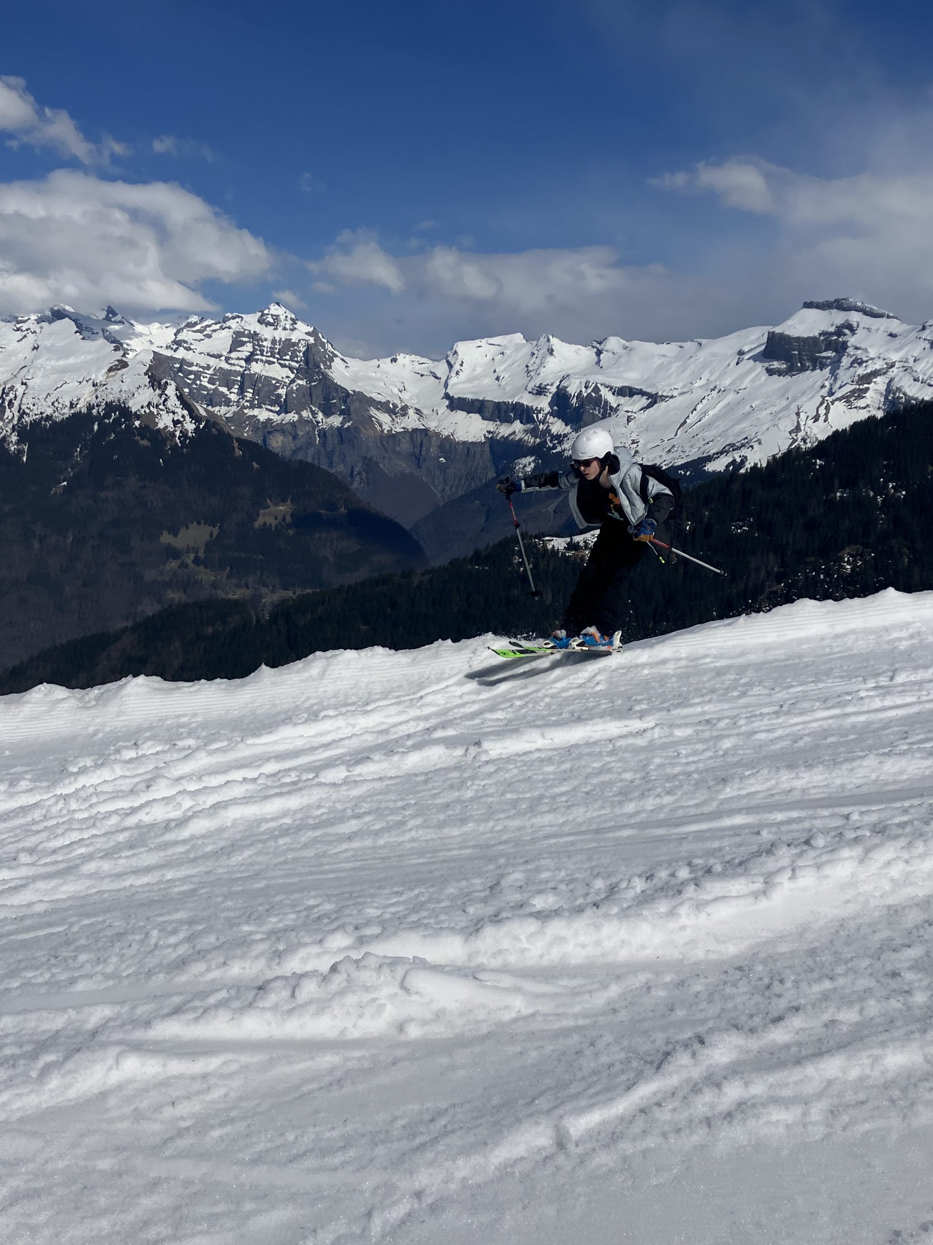 Comme chaque matin, nous nous dirigeons avec entrain vers la remontée Chariande Express, telle une flotte de skieurs déterminés vers les sommets de la montagne des Carroz. Nous entamons notre journée par une série de virages subtils avant de nous lancer dans un grand schuss sur la « Perce-Neige » (bleue), suivi de la verte « Molliachets ». Voilà un échauffement exquis qui nous prépare à affronter la « Rhodos » (rouge), un petit aperçu de la « Combe haut » (bleue), et le boulevard « Zorta » (rouge). Cette matinée témoigne des progrès époustouflants de chaque élève, qui, à chaque descente, semble défier les lois de la gravité avec une aisance inégalée !