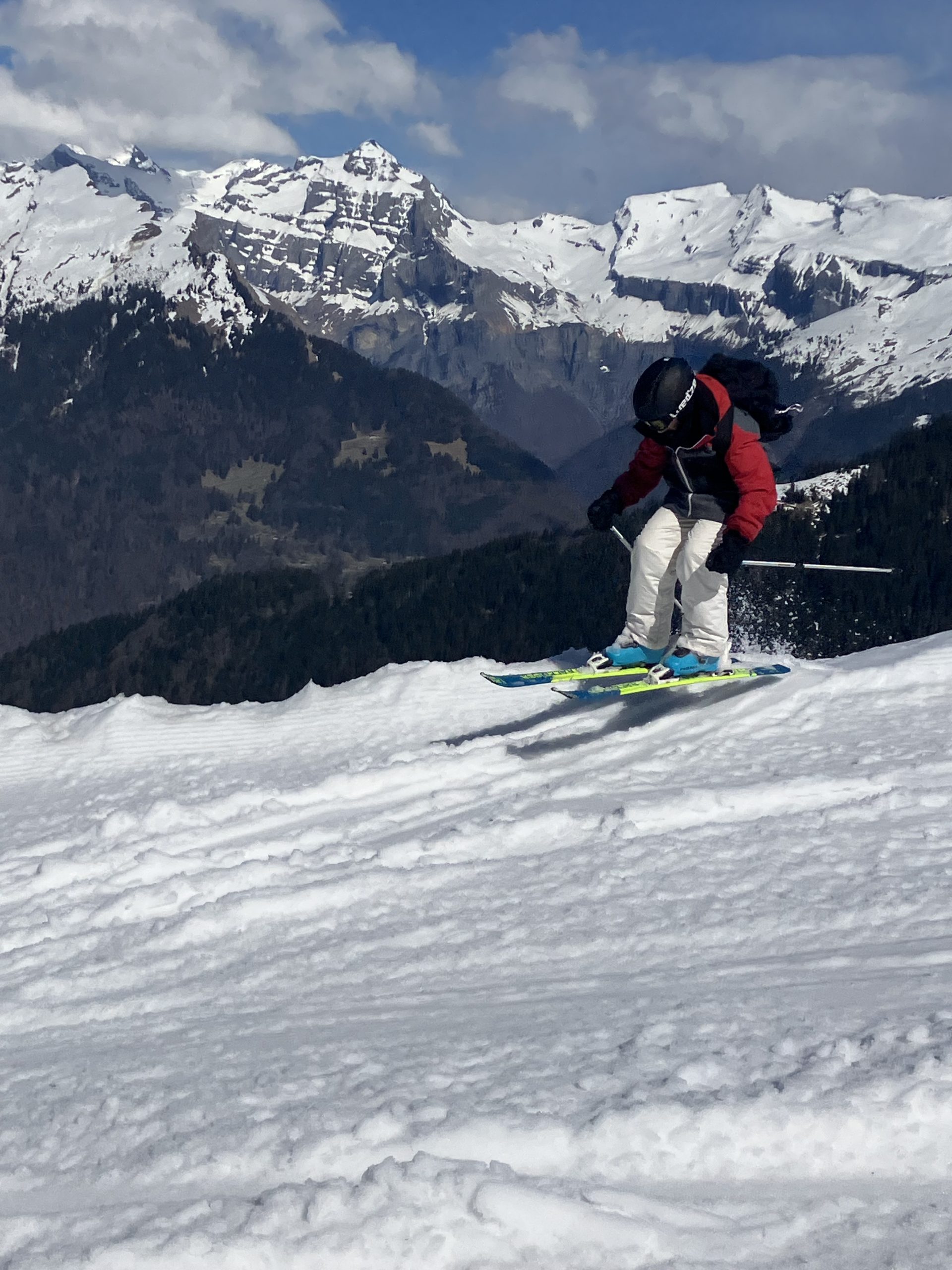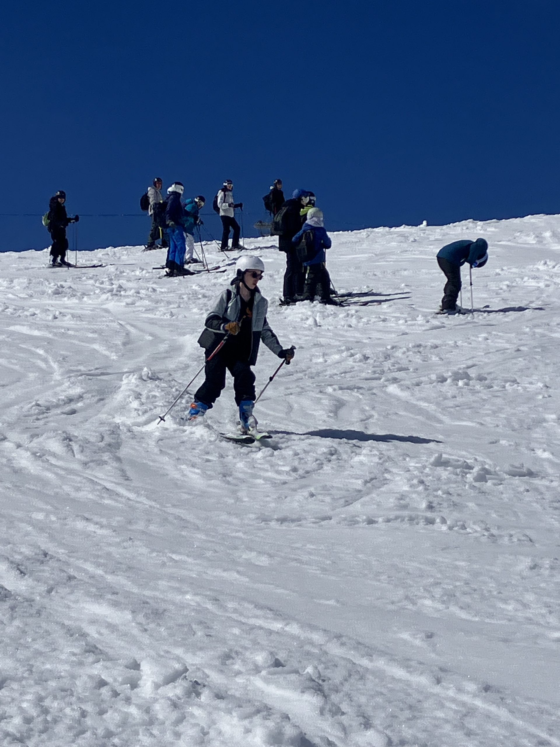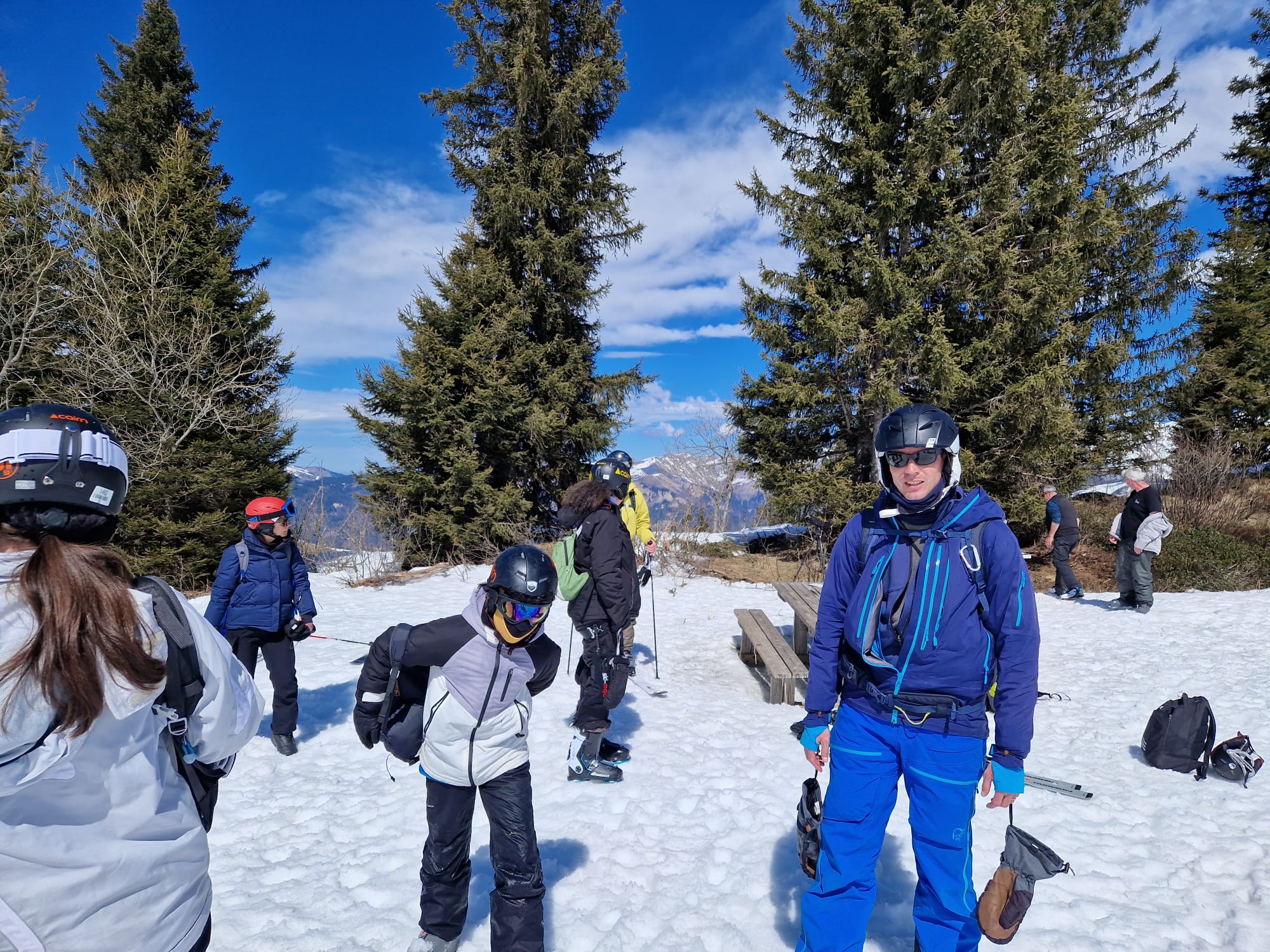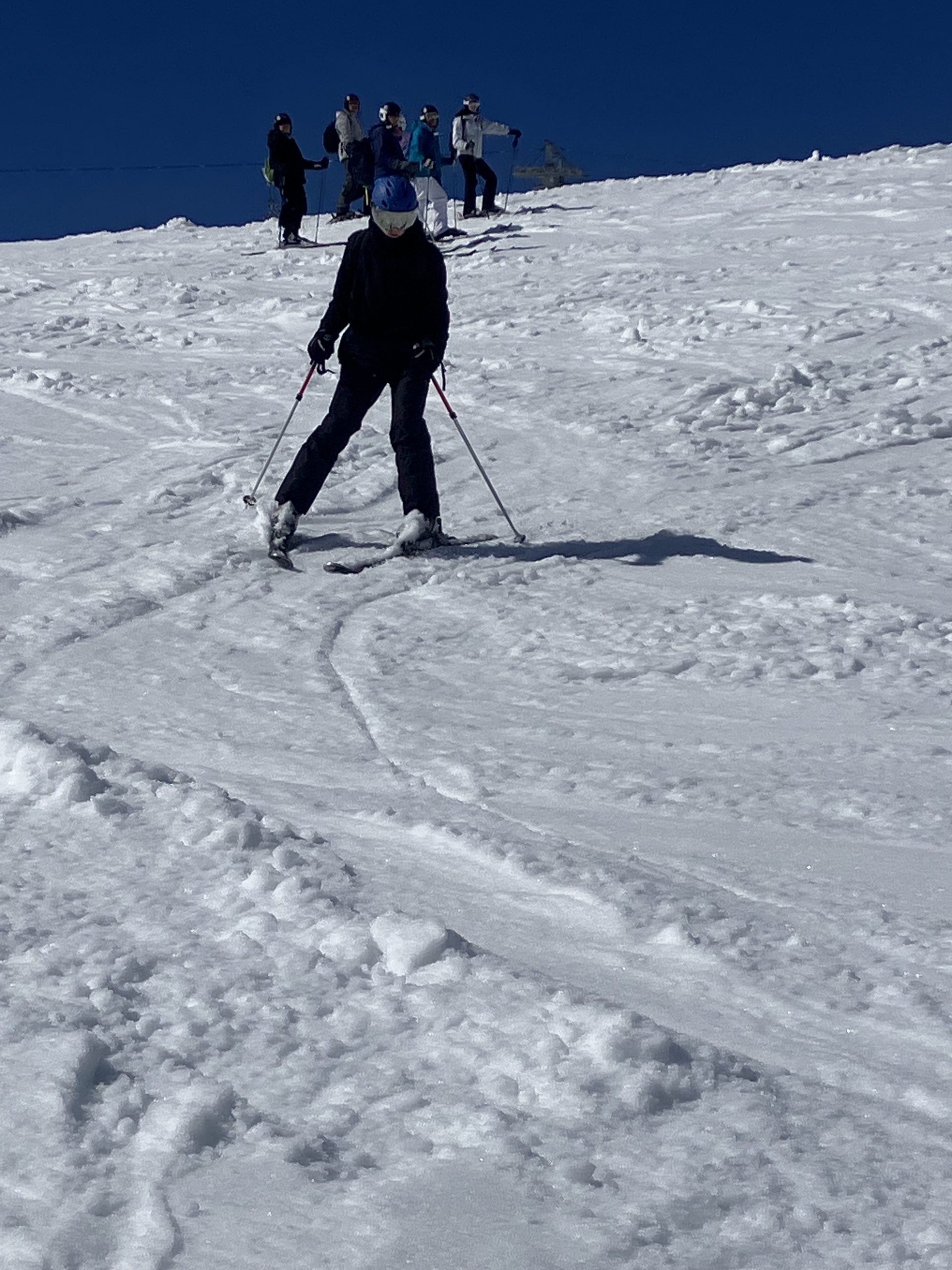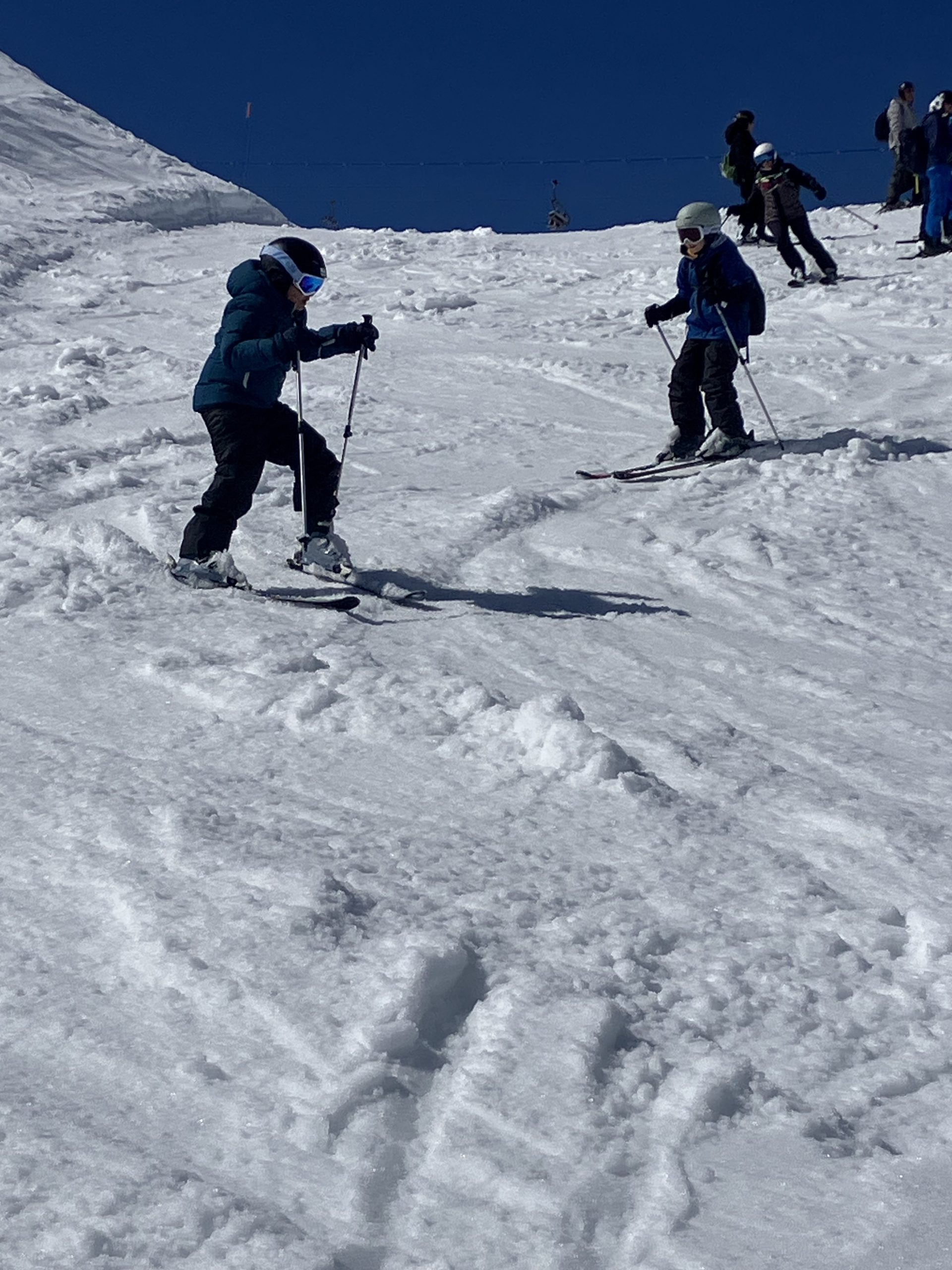 Comme chaque matin, nous nous dirigeons avec entrain vers la remontée Chariande Express, telle une flotte de skieurs déterminés vers les sommets de la montagne des Carroz. Nous entamons notre journée par une série de virages subtils avant de nous lancer dans un grand schuss sur la « Perce-Neige » (bleue), suivi de la verte « Molliachets ». Voilà un échauffement exquis qui nous prépare à affronter la « Rhodos » (rouge), un petit aperçu de la « Combe haut » (bleue), et le boulevard « Zorta » (rouge). Cette matinée témoigne des progrès époustouflants de chaque élève, qui, à chaque descente, semble défier les lois de la gravité avec une aisance inégalée !
