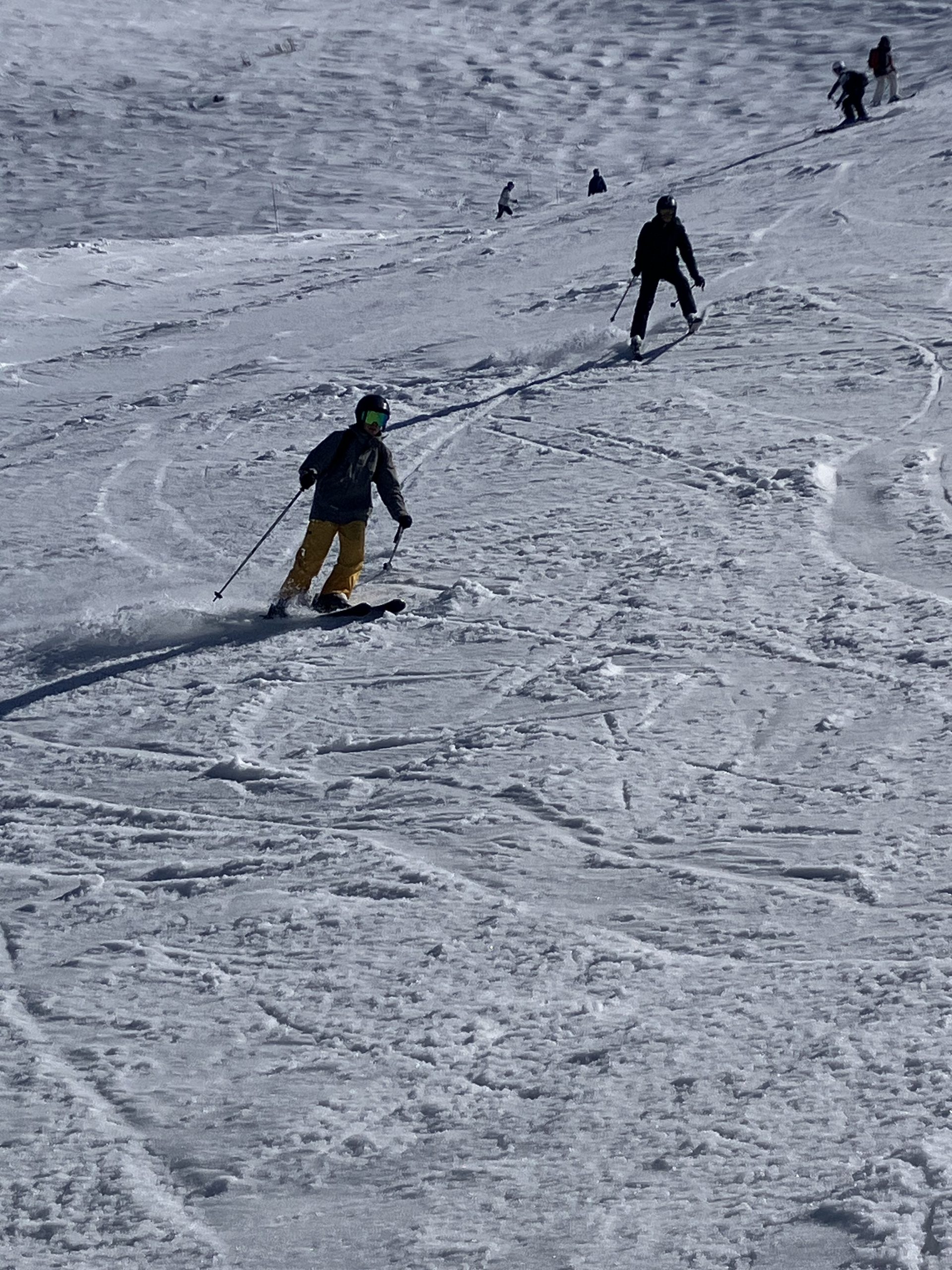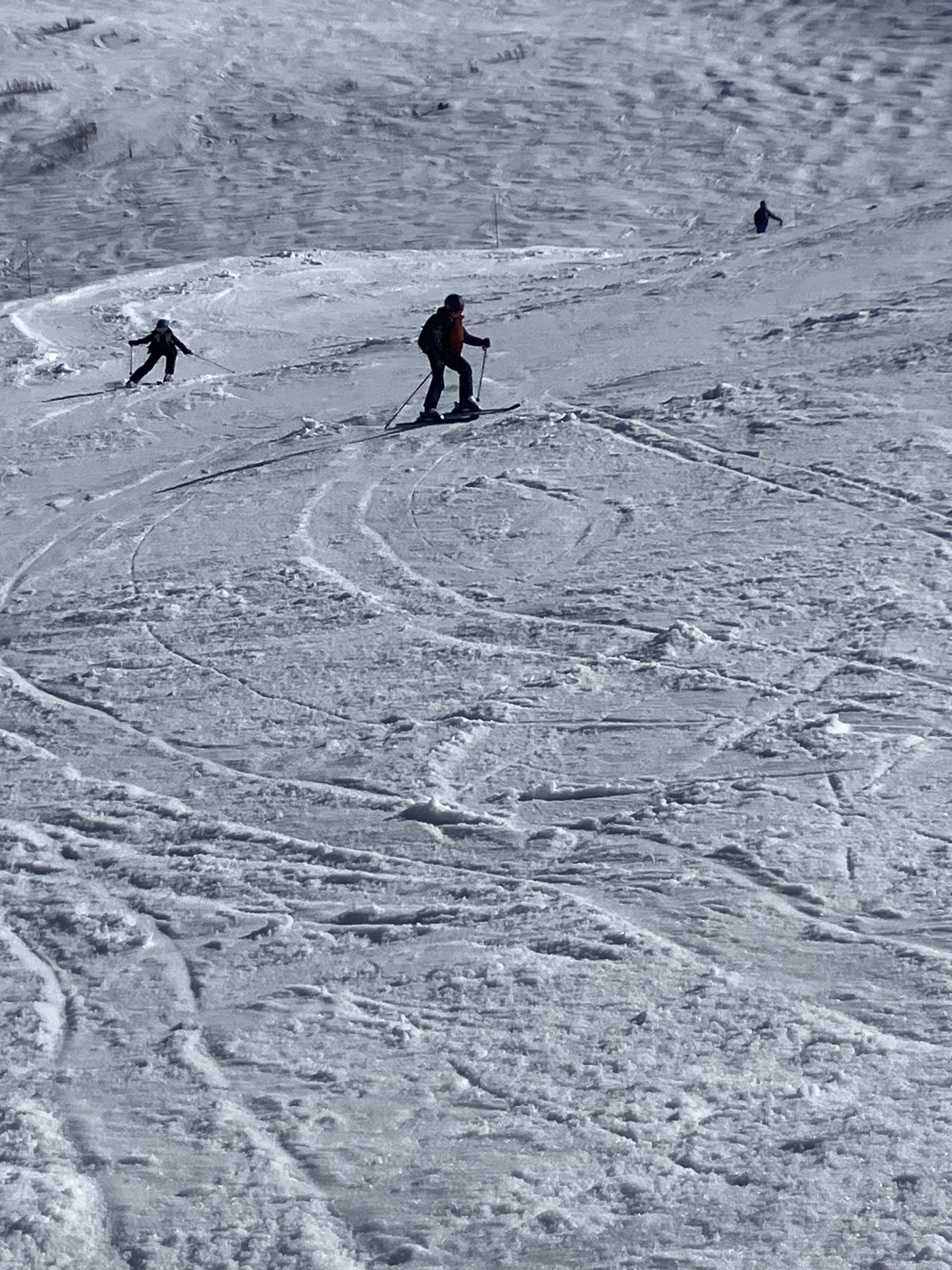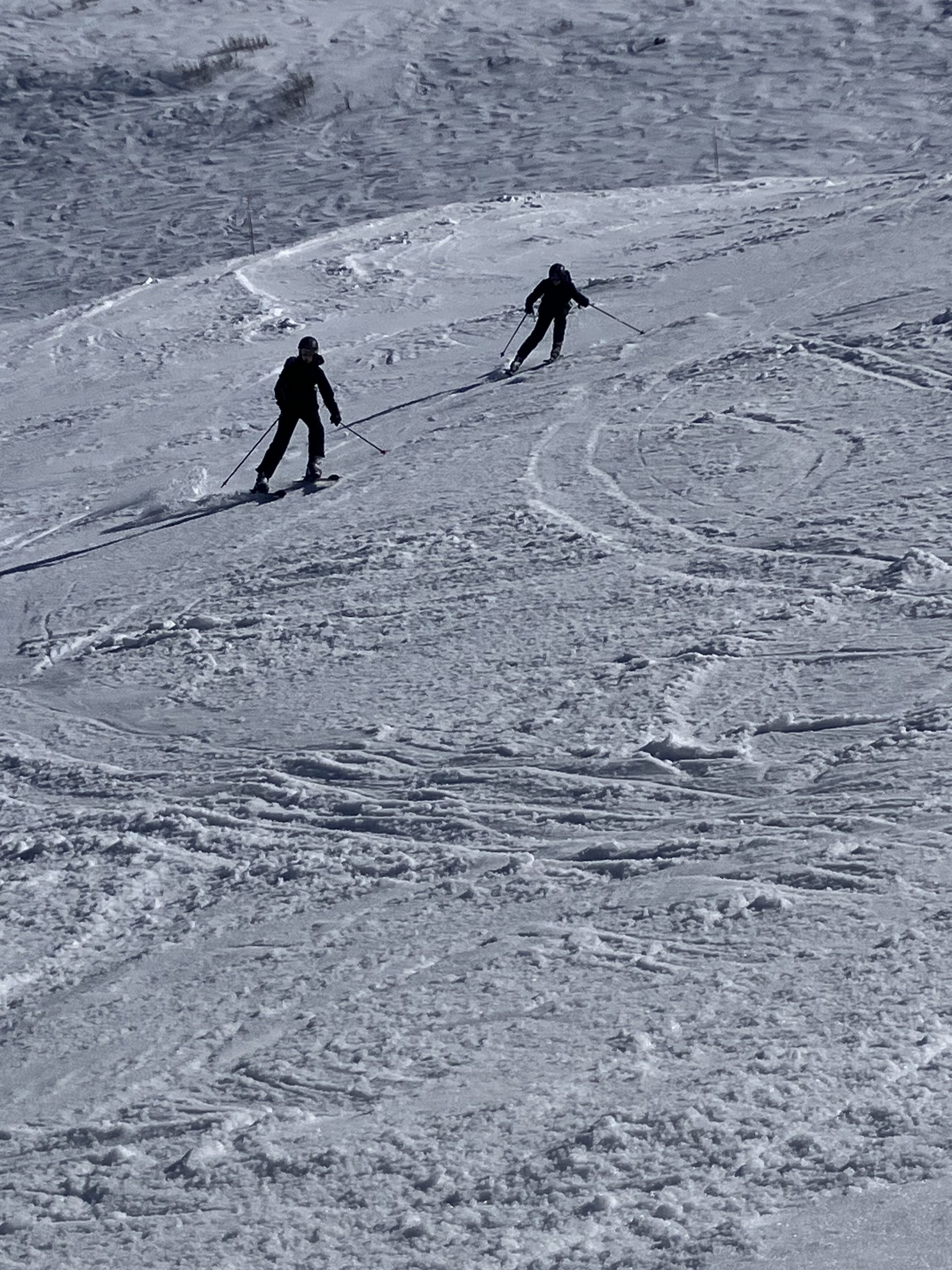 La matinée débute sur une note énergique avec une descente de la magnifique piste rouge « Marmotte » pour échauffer nos muscles, avant de plonger dans la qualité exceptionnelle de la neige en dévalant la piste Aigle Noir dans son intégralité. Cette piste noire, jonchée de bosses, a mis à l’épreuve nos intrépides skieurs, et Adam a perdu un ski, et avec un esprit combatif, il a fait face à la situation avec bravoure. Dévalant les derniers mètres sur ses fesses, il a su maintenir son équilibre tout en glissant avec détermination.