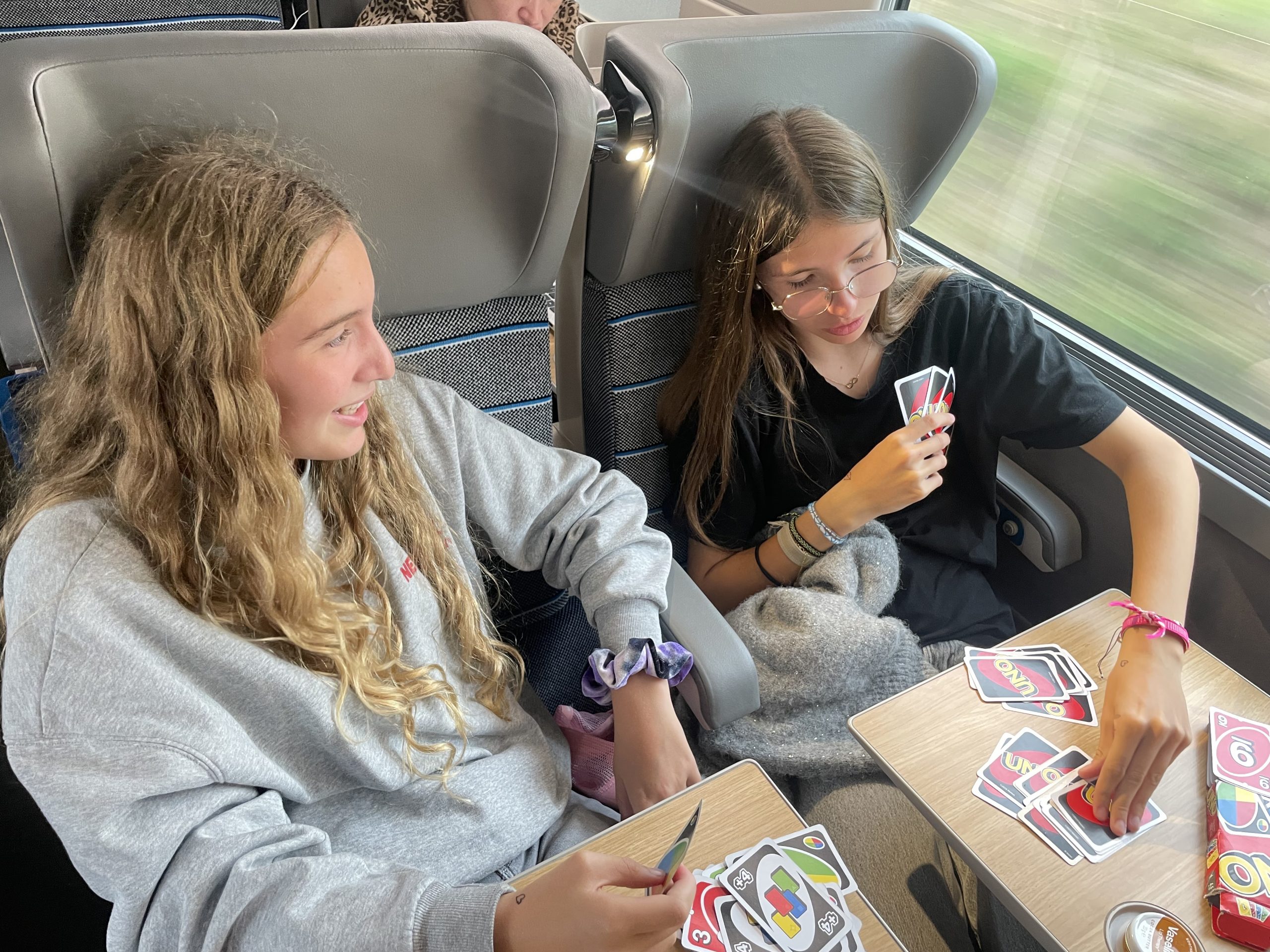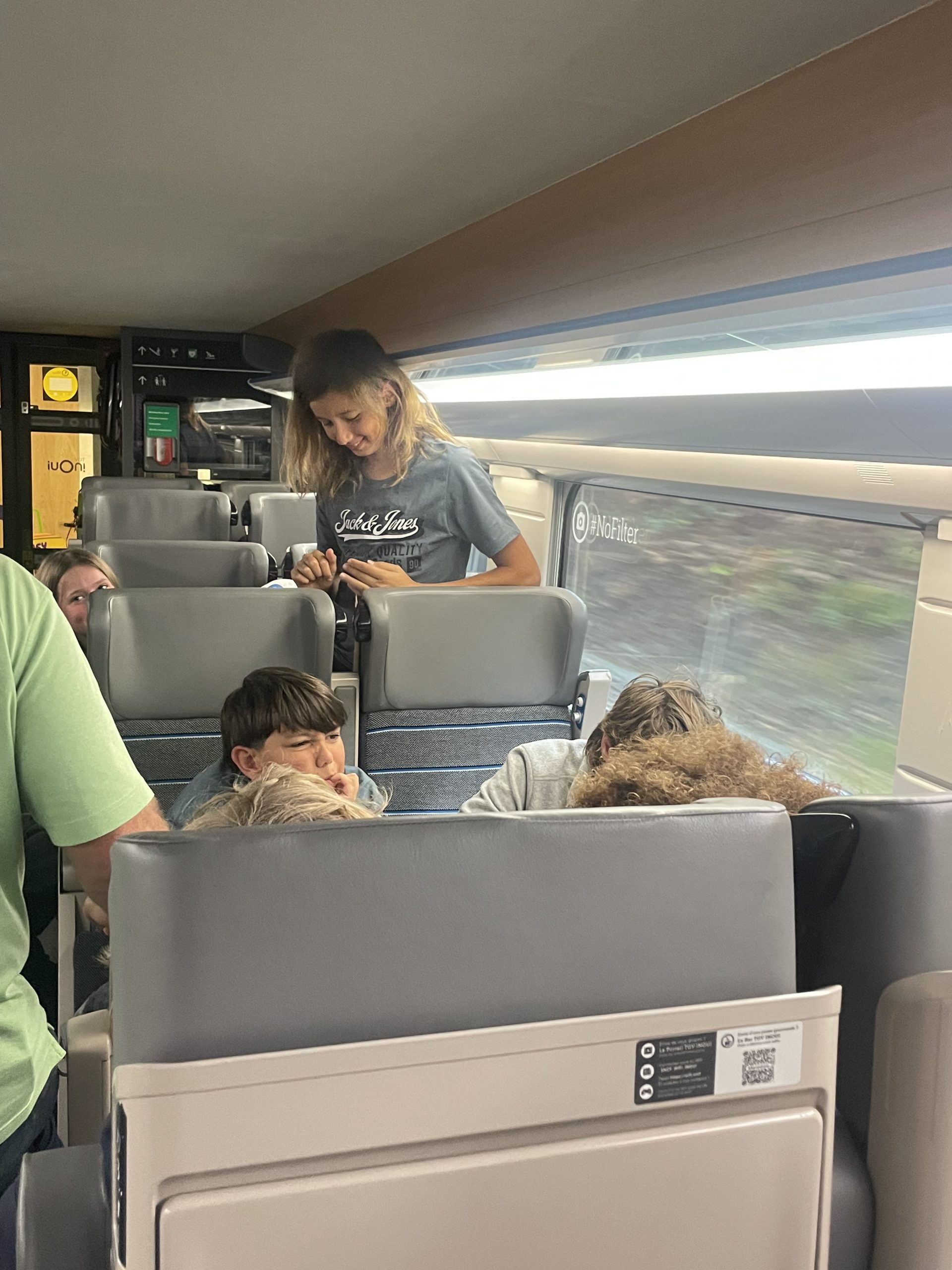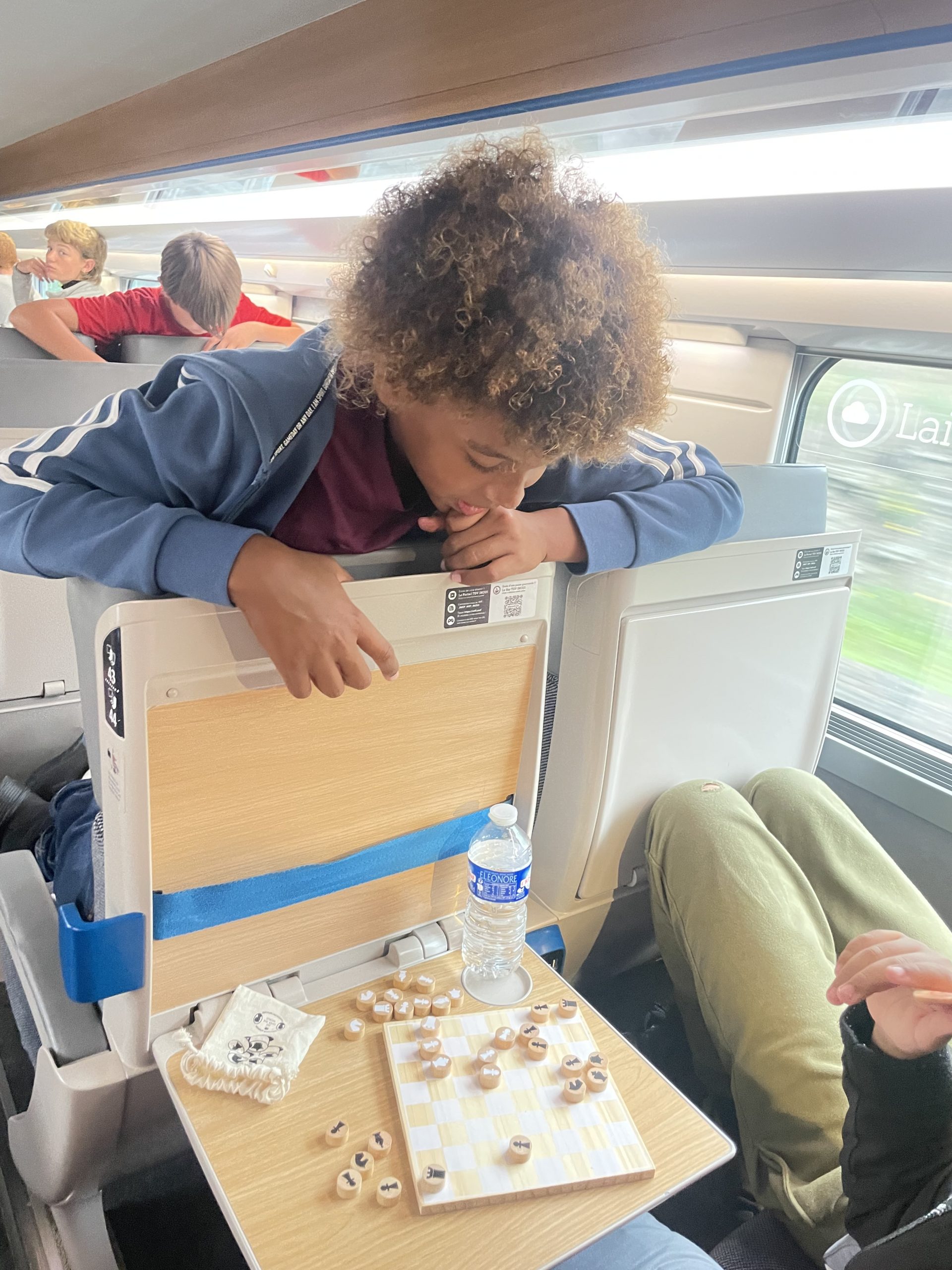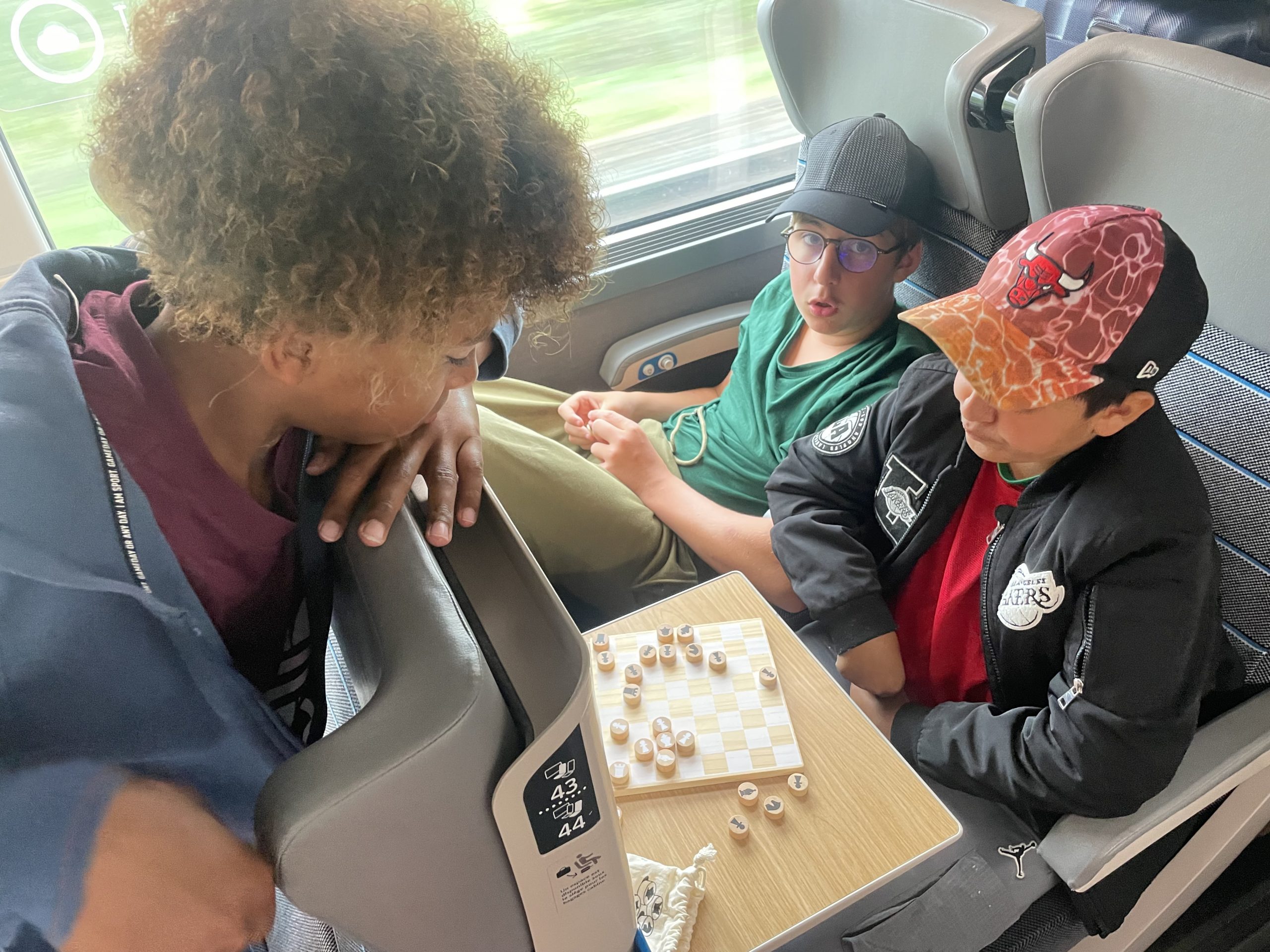 Le train s’ébranle, et avec lui, les derniers instants du séjour. À bord, les jeux s’organisent : UNO, échecs, sept familles… Les cartes s’échangent, les pions s’affrontent, les rires fusent. Le wagon devient salon, terrain de jeu, cocon de transition entre le sable et le retour.