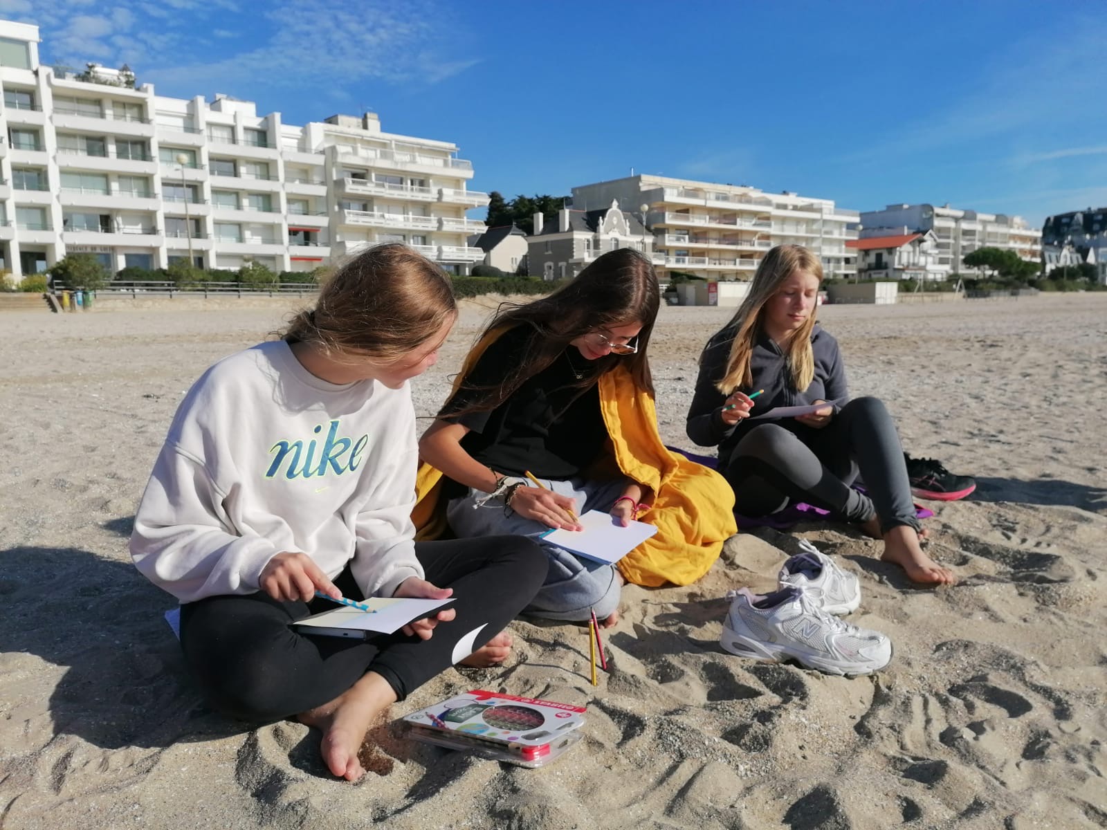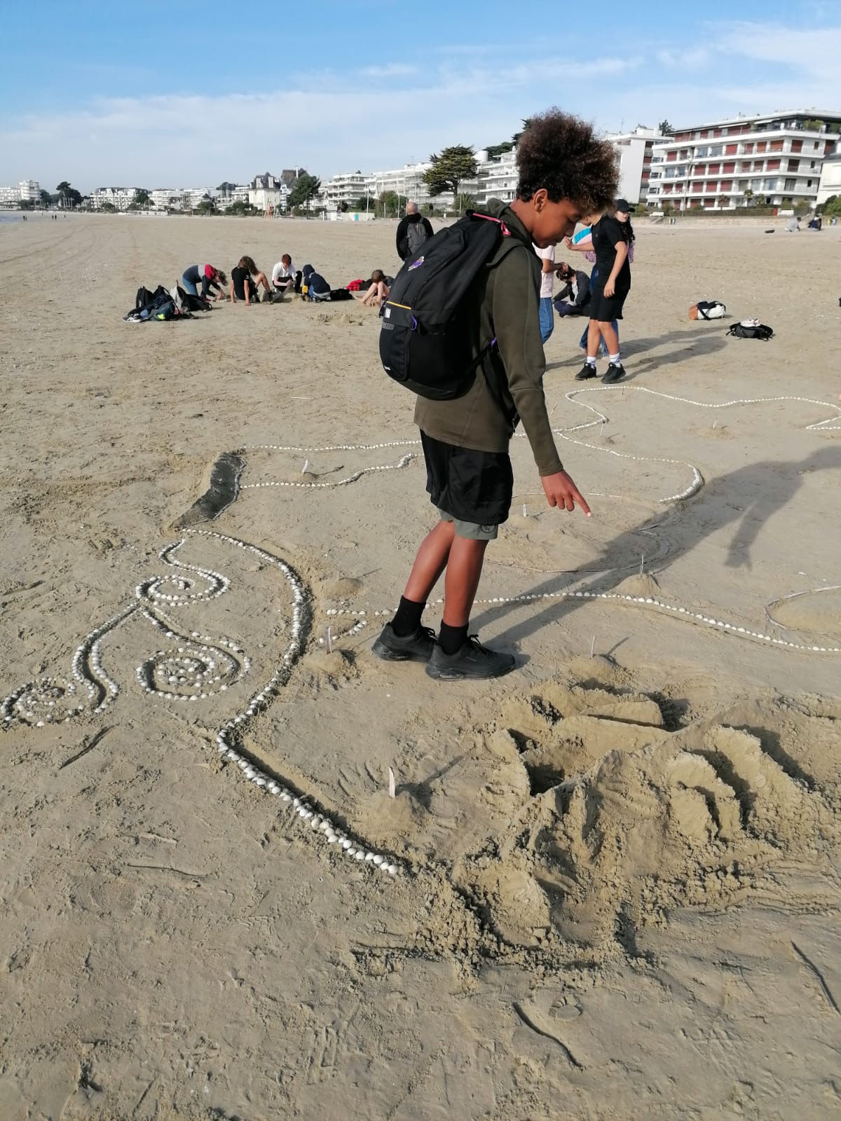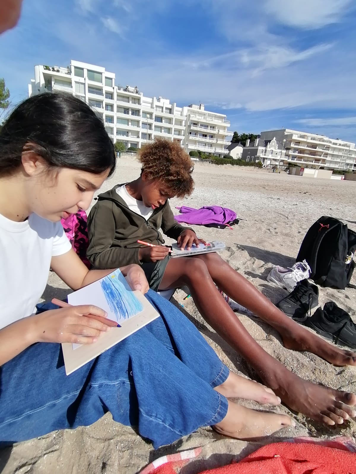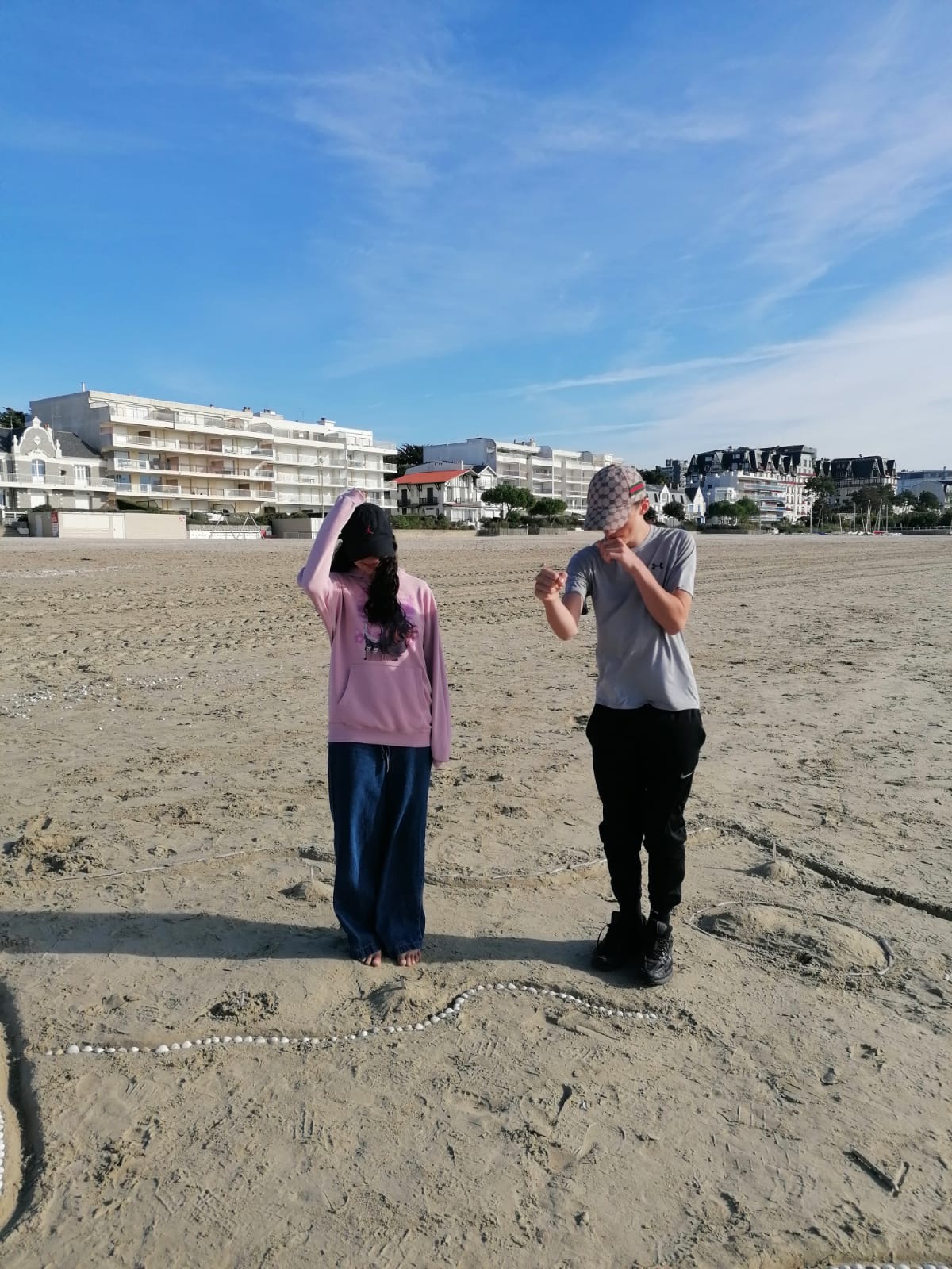 Sandrine, gardienne du savoir et du sable, a proposé à quelques élèves de troisième une révision de la carte de France, miraculeusement intacte malgré les caprices de la marée. Puis, dans un geste digne d’un prestidigitateur, elle a sorti une boîte de crayons de couleur. Abdallah, Aline, Camille, Emma et Syrine se sont alors lancés dans une séance de dessin, où le sable servait de toile et le ciel de muse.