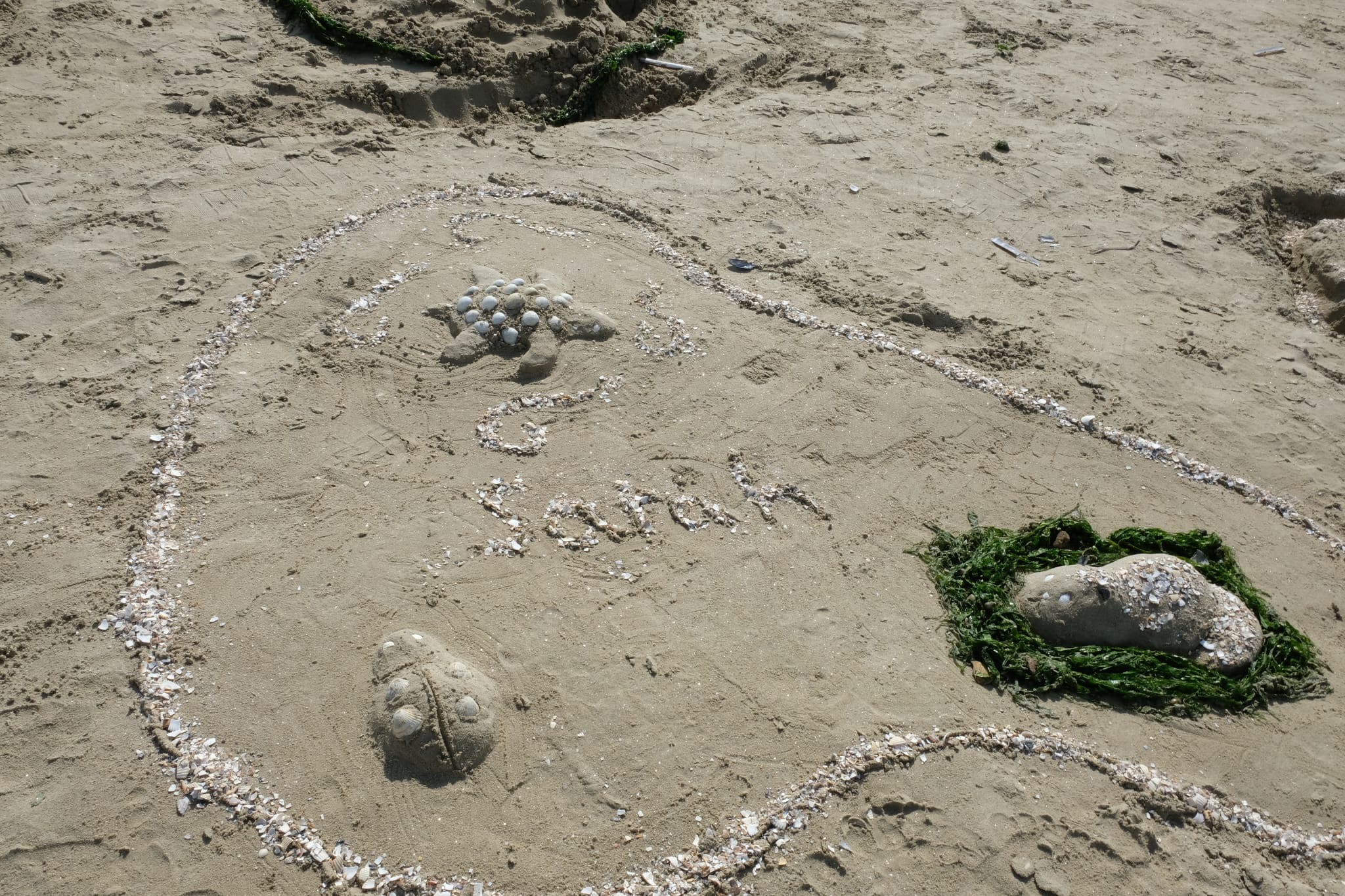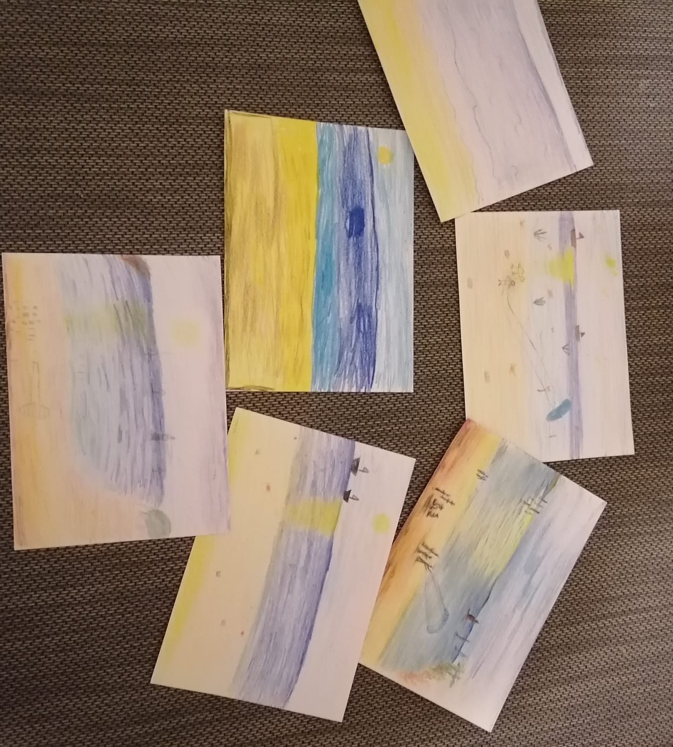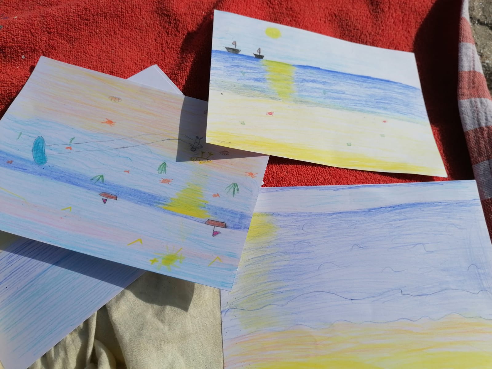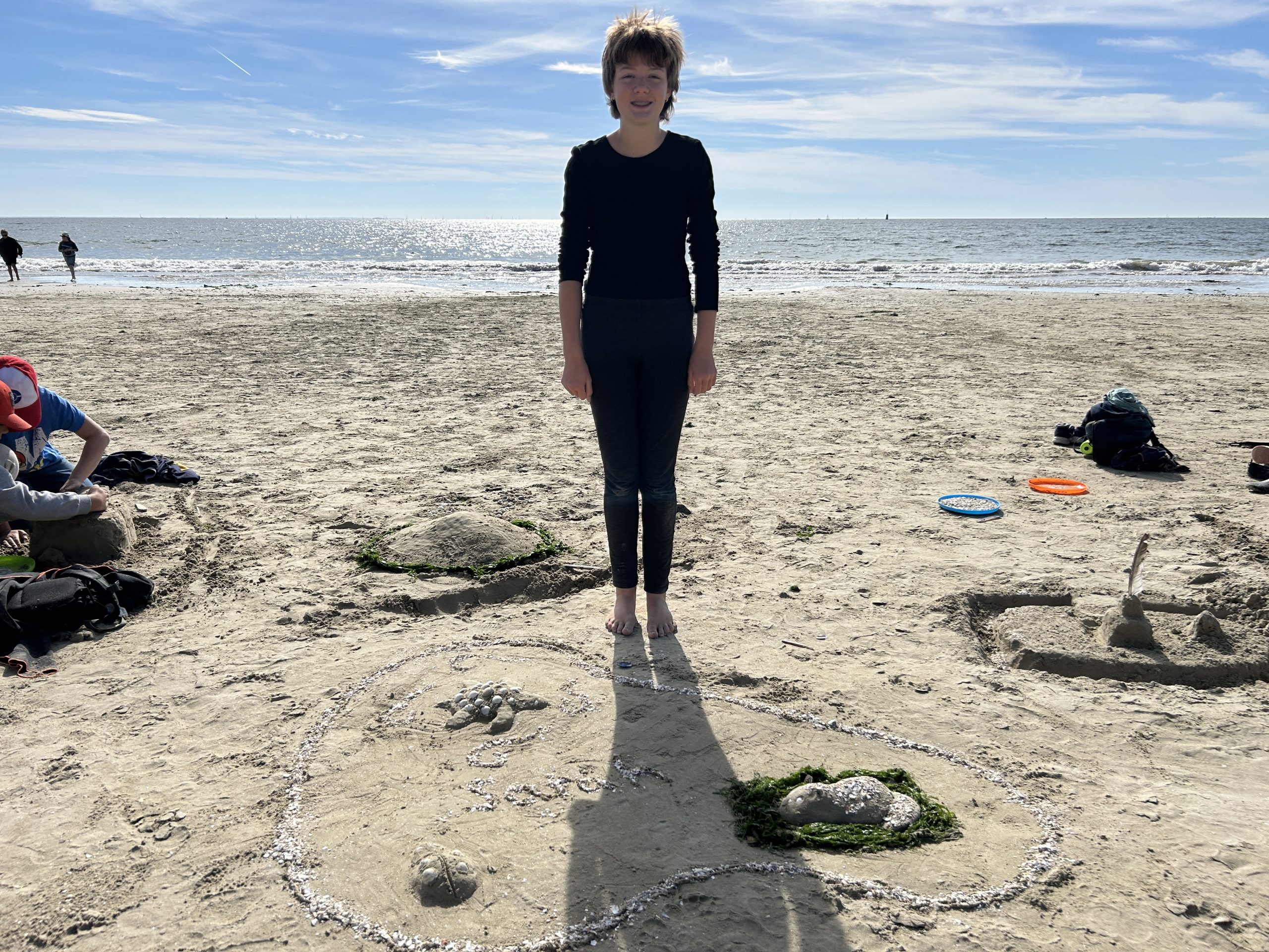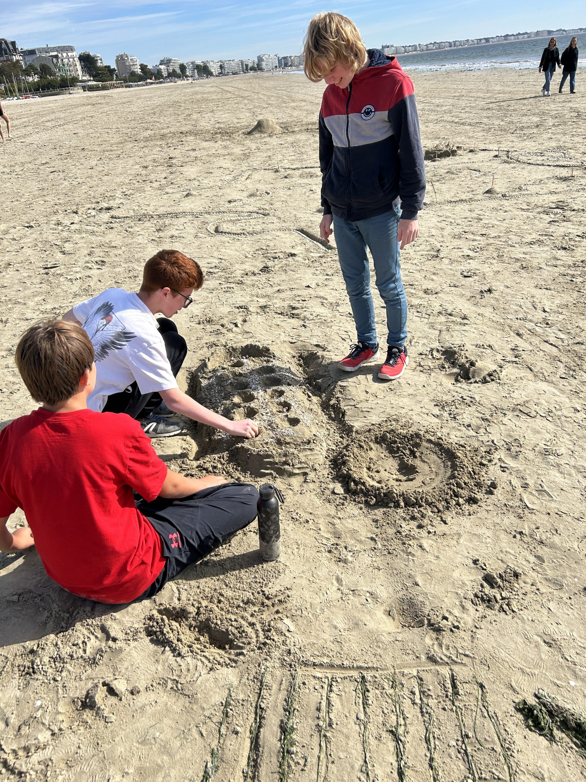 Sandrine, gardienne du savoir et du sable, a proposé à quelques élèves de troisième une révision de la carte de France, miraculeusement intacte malgré les caprices de la marée. Puis, dans un geste digne d’un prestidigitateur, elle a sorti une boîte de crayons de couleur. Abdallah, Aline, Camille, Emma et Syrine se sont alors lancés dans une séance de dessin, où le sable servait de toile et le ciel de muse.