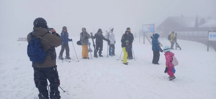 Après le repas, nous reprenons le Chariande Express. Mais au sommet, la montagne nous accueille autrement : le vent se lève, puissant, presque vivant. De gros flocons tombent en rafales, brouillant les contours du paysage. La météo a changé de visage.