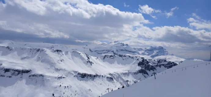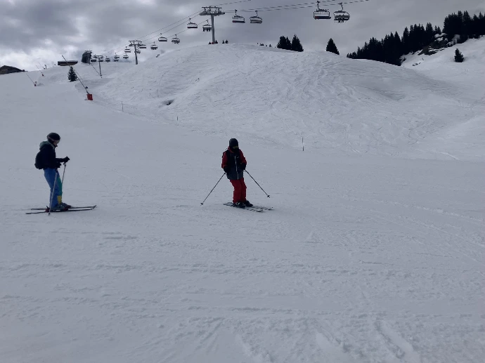 Nous montons par le Chariande Express, puis glissons sur la bleue « Perce‑Neige », suivie de « l’Arête ». La rouge « Crête » nous offre un premier défi avant de déboucher sur la bleue « Sairon ».