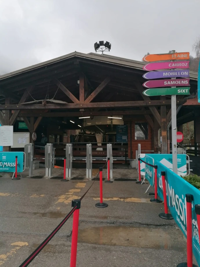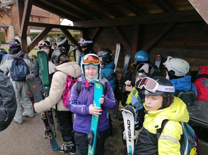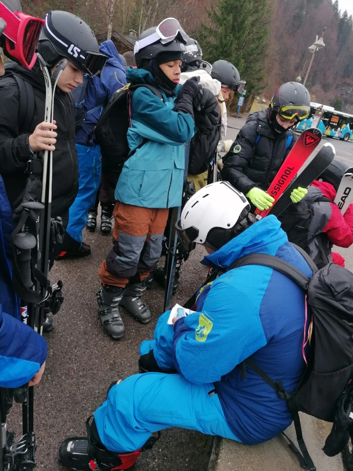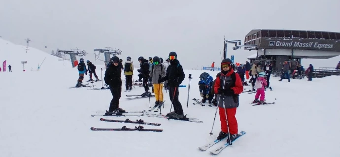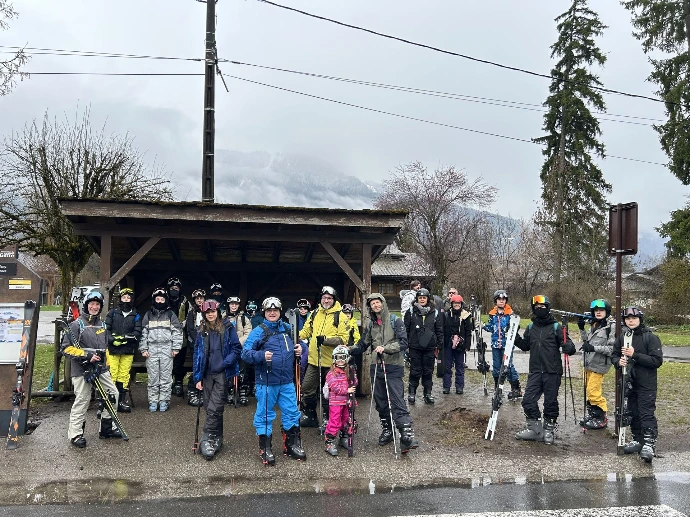 Après un petit déjeuner réconfortant, nous avons préparé nos pique‑niques, gestes simples mais chargés d’une excitation discrète : celle de partir, enfin, vers les pistes. Puis vint le moment de s’équiper, de serrer les chaussures, d’ajuster les casques, de sentir le poids familier des skis sur l’épaule. À 9h37, la navette nous a emportés vers le Grand Massif, comme un souffle qui nous tirait doucement vers l’altitude.