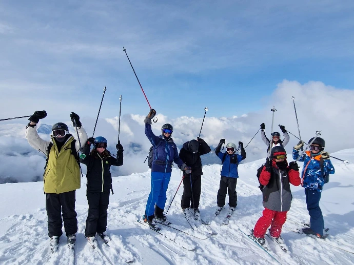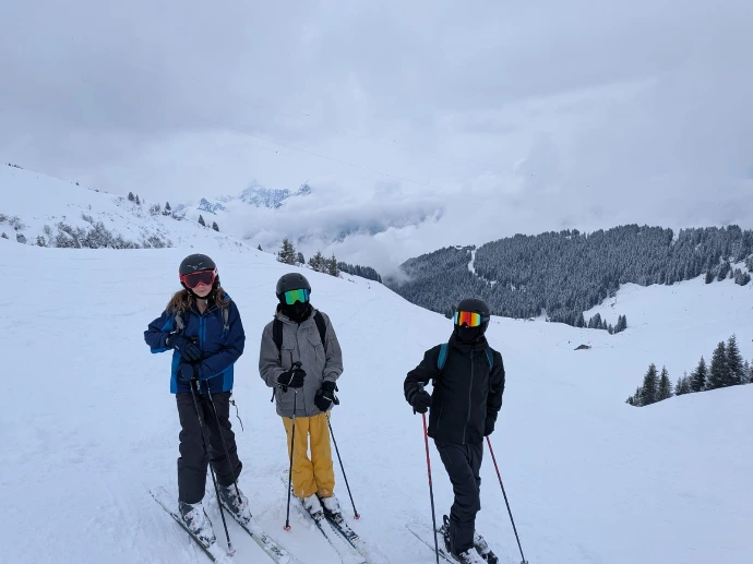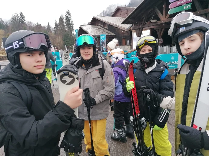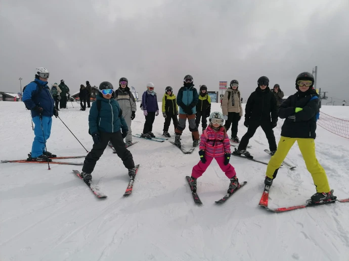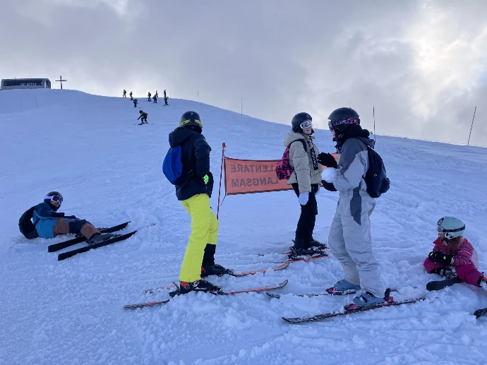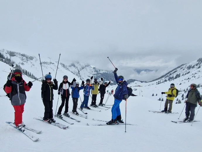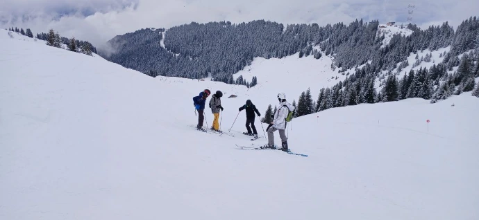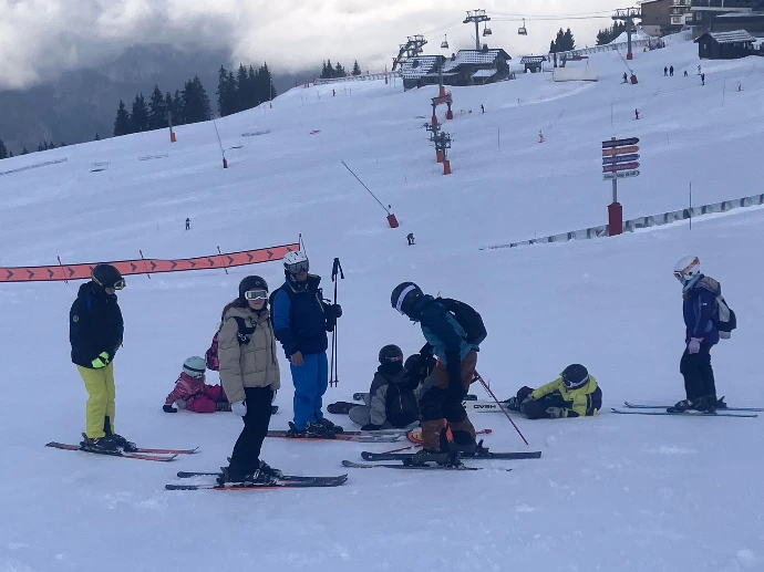 Raphaël a guidé Lino, Clément et Robin. Alexandre a pris sous son aile Lucio, Gaspard et Cassandre. Frédéric et Sandrine ont accompagné le reste du groupe — Aline, Emma, Camille, Lyse, Sarah, Gabrielle, Liam, Tom, Arthur, Edem, Matthew et Abdallah — pour apprivoiser la glisse ou retrouver les sensations oubliées sur les pistes « Château » et « Babuches ».