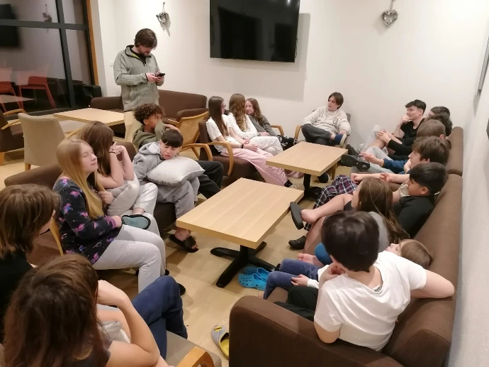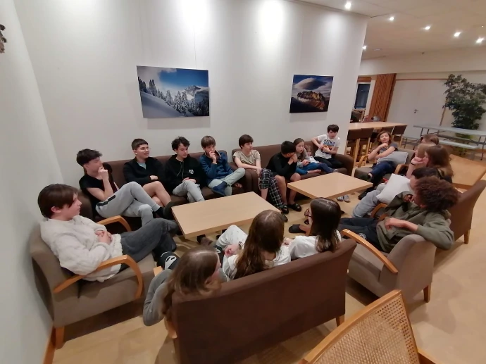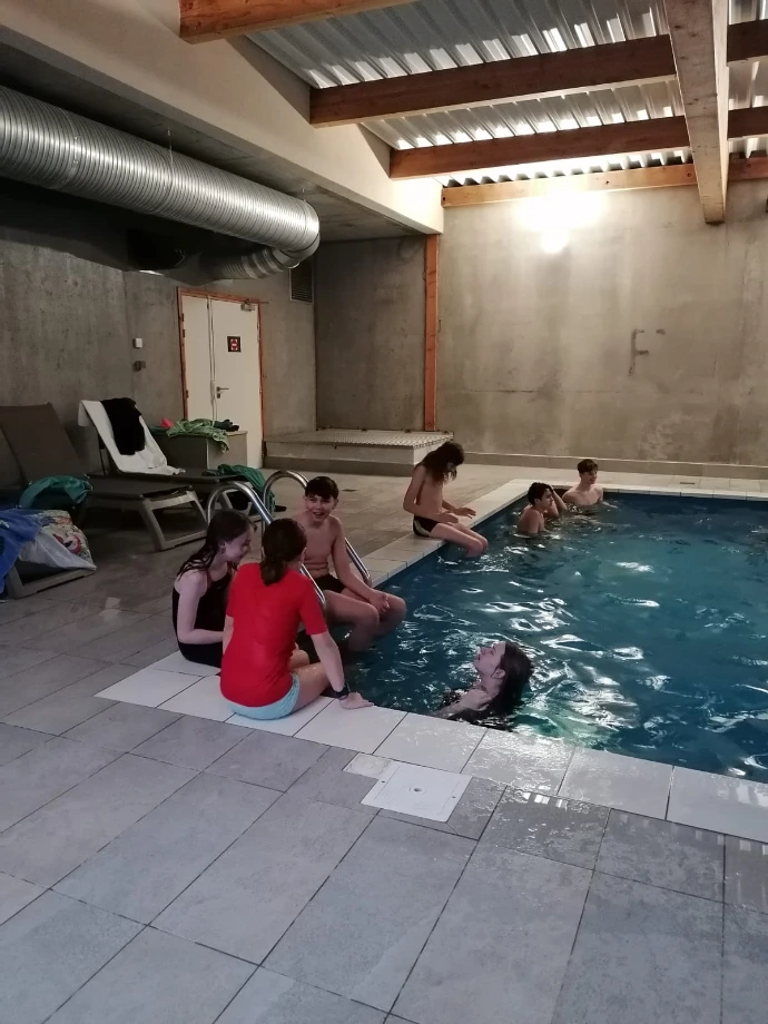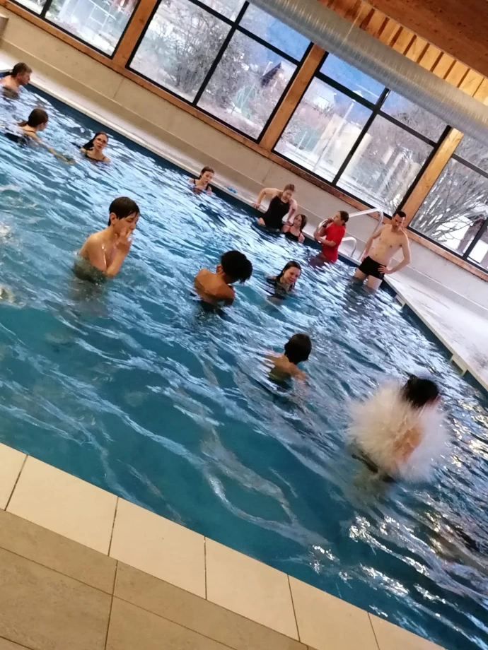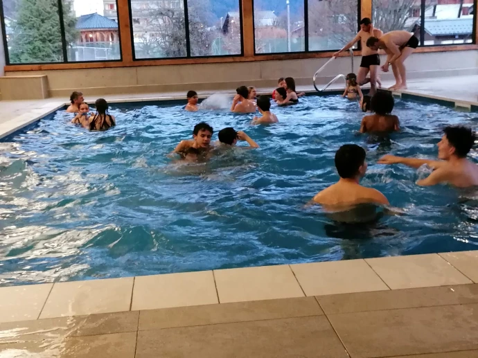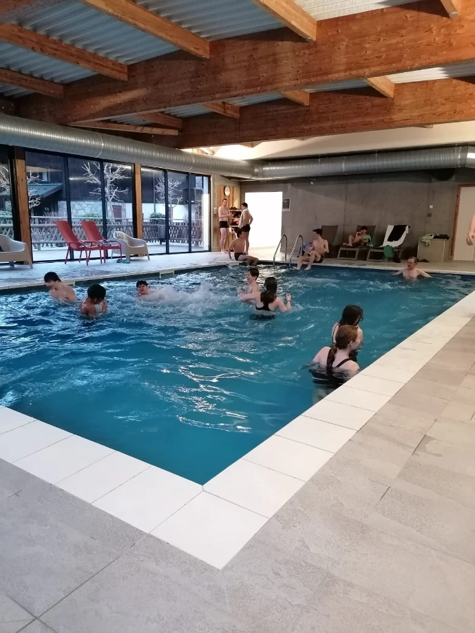 De retour au chalet, la navette nous a déposés devant la chaleur familière du Bérouze. Un goûter, quelques éclats de voix, puis la piscine : pour certains, une douce détente ; pour d’autres, l’occasion de multiplier bombes et saltos dans un enthousiasme contagieux.